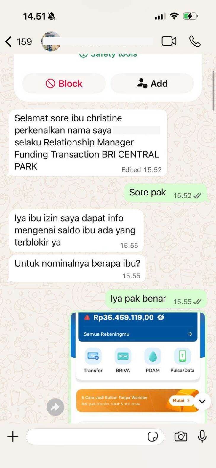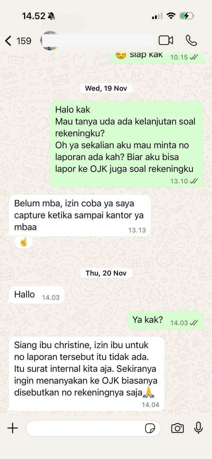Saya sendiri tidak pernah bertransaksi dan tidak mengenal orang bernama A tersebut. Ketika saya bertanya lebih lanjut, mengenai laporan si A, tanggal berapa, dan alasan saya dilaporkan padahal saya tidak mengenalnya, pihak BRI hanya menjawab bahwa mereka juga tidak tahu. Mereka hanya menahan saldo rekening saya tanpa penjelasan lebih lanjut.