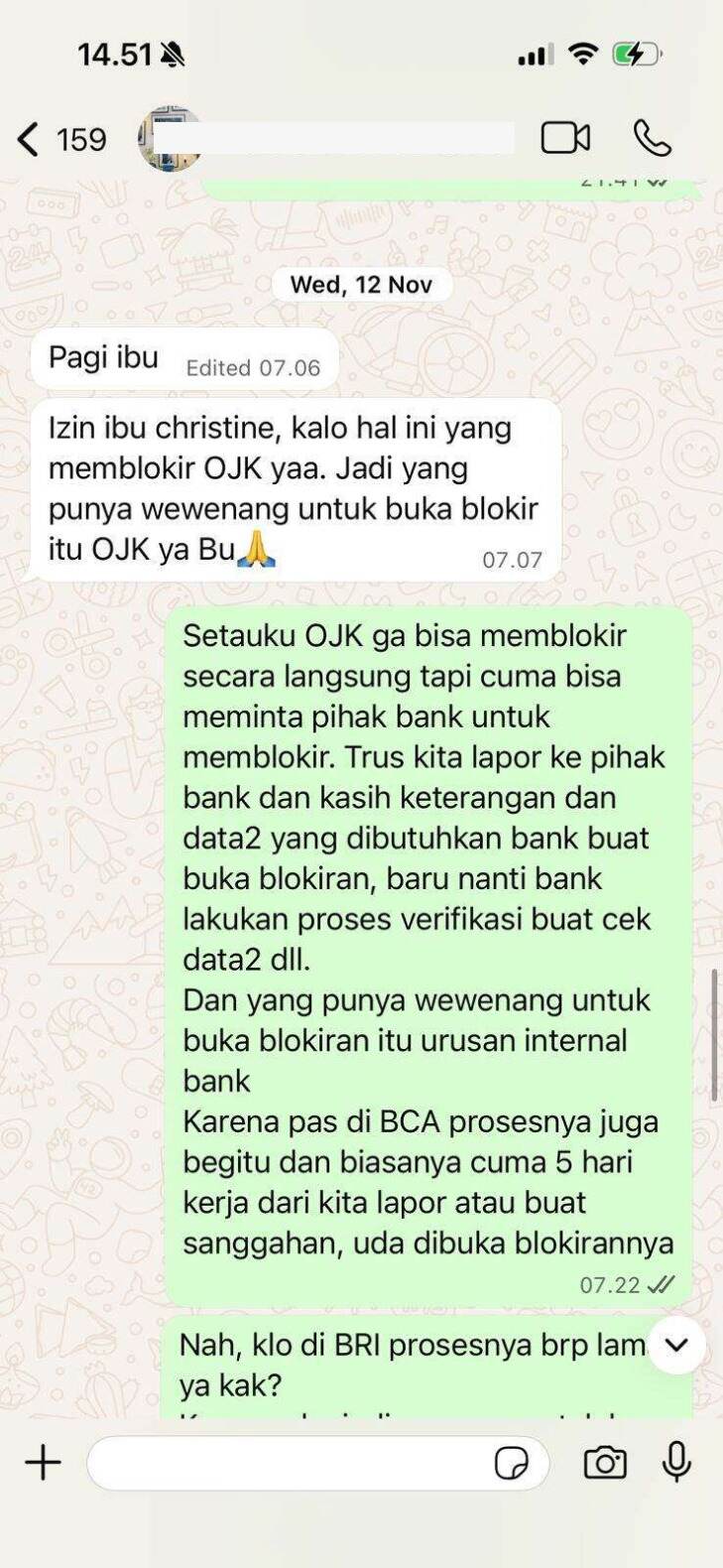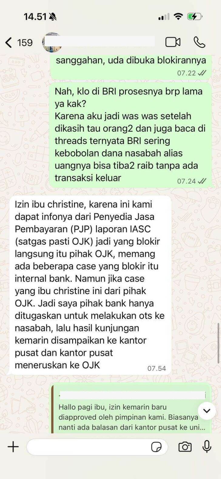Saya sudah melakukan follow up ke BRI dan menghubungi orang finance dari cabang BRI CP (APL Tower) yang membantu saya, tetapi dia juga tidak memberikan kejelasan dan update. Surat pernyataannya juga tidak diberikan oleh pihak BRI meskipun saya sudah memintanya. Bahkan ketika saya meminta nomor laporan yang seharusnya pihak BRI bantu untuk mengurus pembukaan pemblokiran, mereka tidak memberikan informasi tersebut dan menyatakan bahwa itu hanya untuk keperluan internal mereka. Lalu, bagaimana saya bisa mengetahui kelanjutan rekening saya? Sudah lebih dari 3 bulan, status saldo saya masih tertahan.