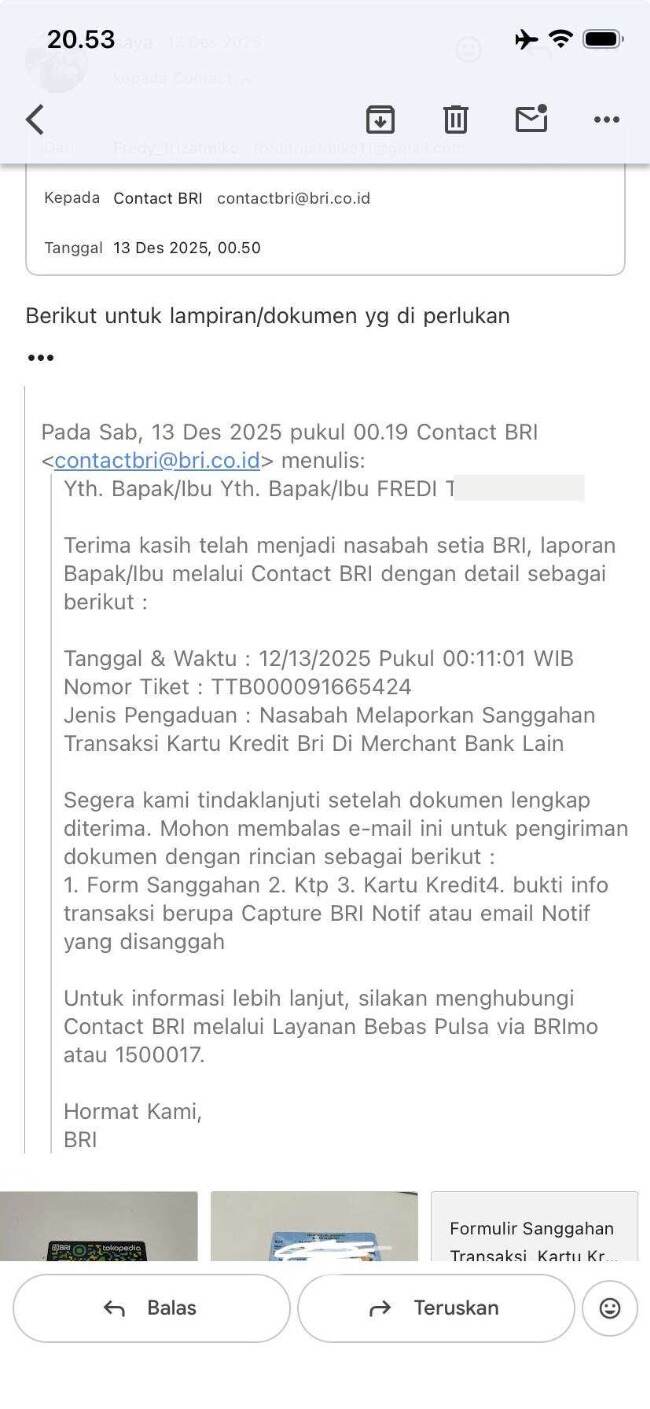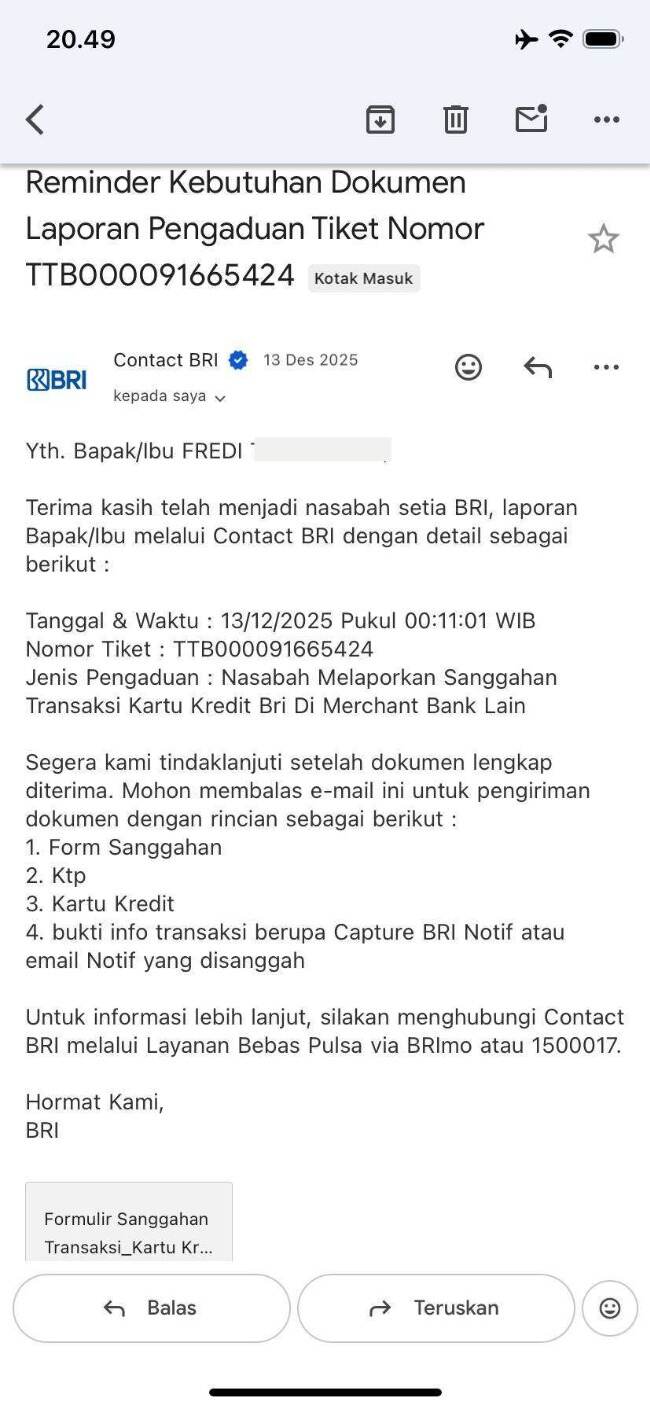 Pihak BRI langsung memproses pemblokiran kartu dan meminta saya untuk melampirkan dokumen sanggahan. Pada pukul 00:50 WIB, saya melengkapi dokumen yang diminta melalui email, dengan nomor tiket pelaporan: TTB000091665424. Setelah 5 hari kerja, pada tanggal 19 Desember 2025, saya menerima kartu baru. Namun form sanggahan saya belum mendapatkan tindak lanjut.