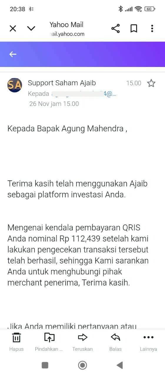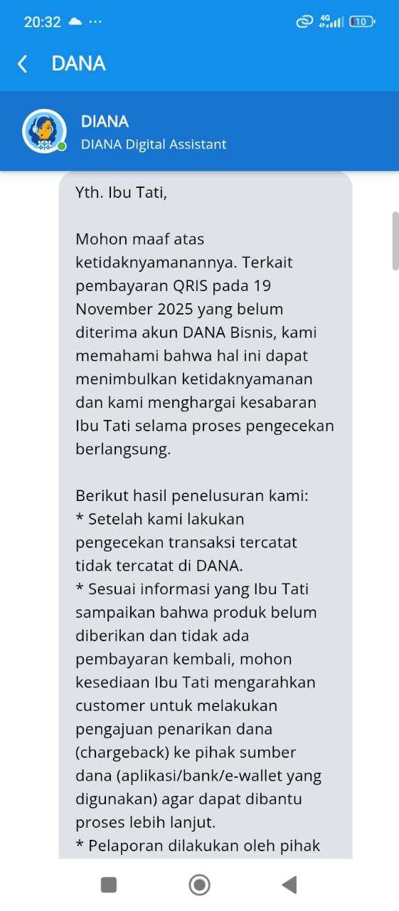 Pada hari Rabu, 19 November 2025, saya melakukan transaksi dengan scan QRIS ke DANA Bisnis melalui aplikasi Ajaib. Keterangan di aplikasi Ajaib menunjukkan bahwa transaksi berhasil, namun informasi dari penjual tidak masuk ke merchant untuk nominal tersebut.