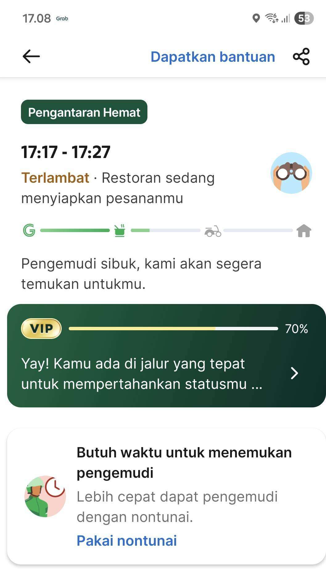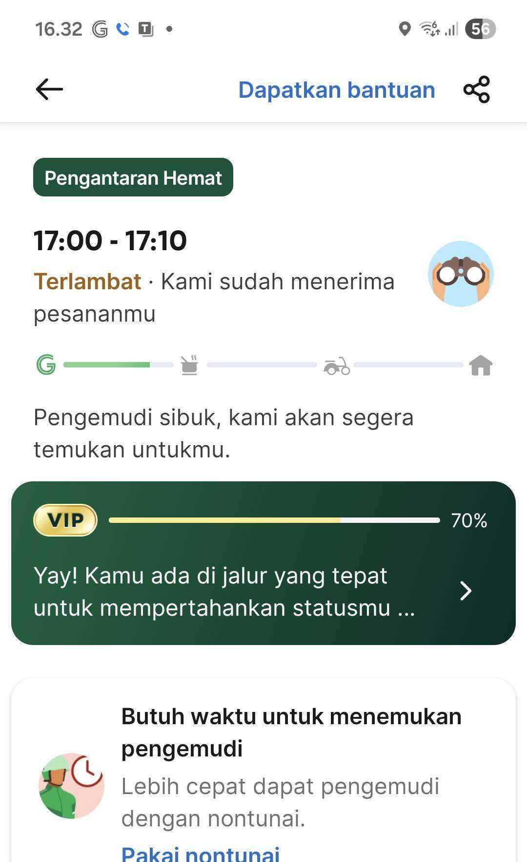 Pada Gambar 2, status pesanan saya terlambat menjadi pukul 17.00–17.10. Bayangkan, dari pukul 15.40, saat saya memulai pesanan, masih saja belum mendapatkan driver. Resto pun belum memulai memasak.