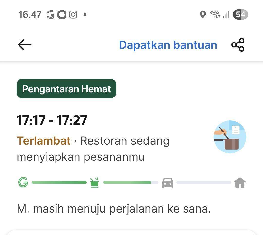 Pada Gambar 1, itu adalah ketika saya mau memesan makanan. Saat itu jam di tempat saya adalah pukul 15.40 (bisa dilihat di pojok kiri atas gambar). Saya memesan menggunakan pengantaran hemat, yang mana dari pengalaman sebelumnya, meskipun menggunakan pengantaran prioritas, saya tetap saja terlambat. Perkiraan waktu sampai adalah pukul 16.45–16.55.