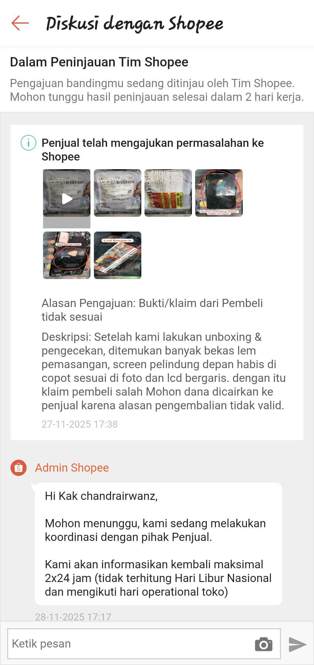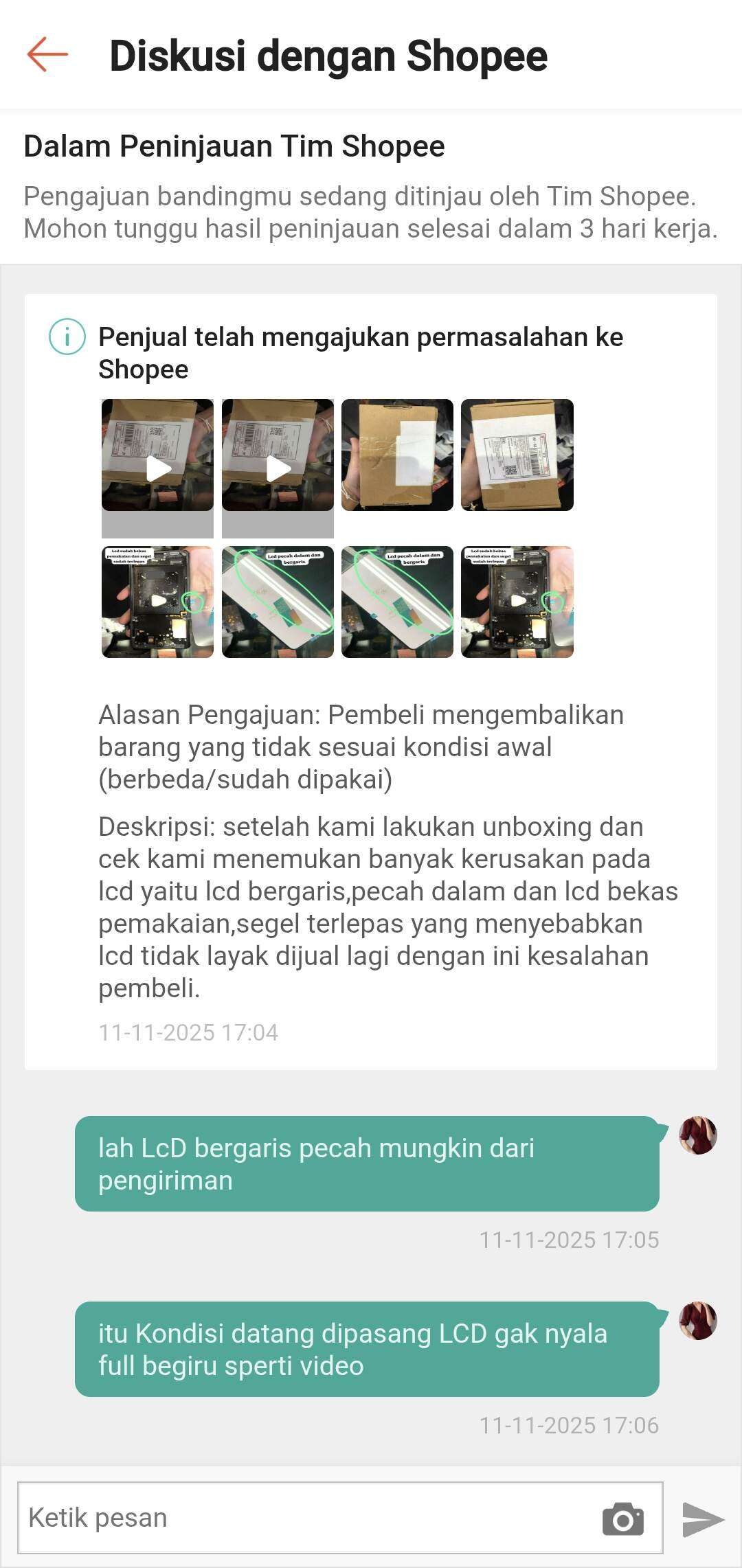 Kemudian saya komplain ke Shopee dan meminta pengembalian dana. Saya mengirim kembali LCD tersebut karena memang tidak bisa dipakai. Namun seller menolak pengembalian dengan alasan barang telah dibuka dan dipakai. (Ya jelas barang dibuka dan dicoba, karena harus dipasang dulu ke HP-nya.) Apakah seller mengira pembeli langsung tahu LCD itu normal hanya dari tampilan fisik saat pertama kali dibuka?