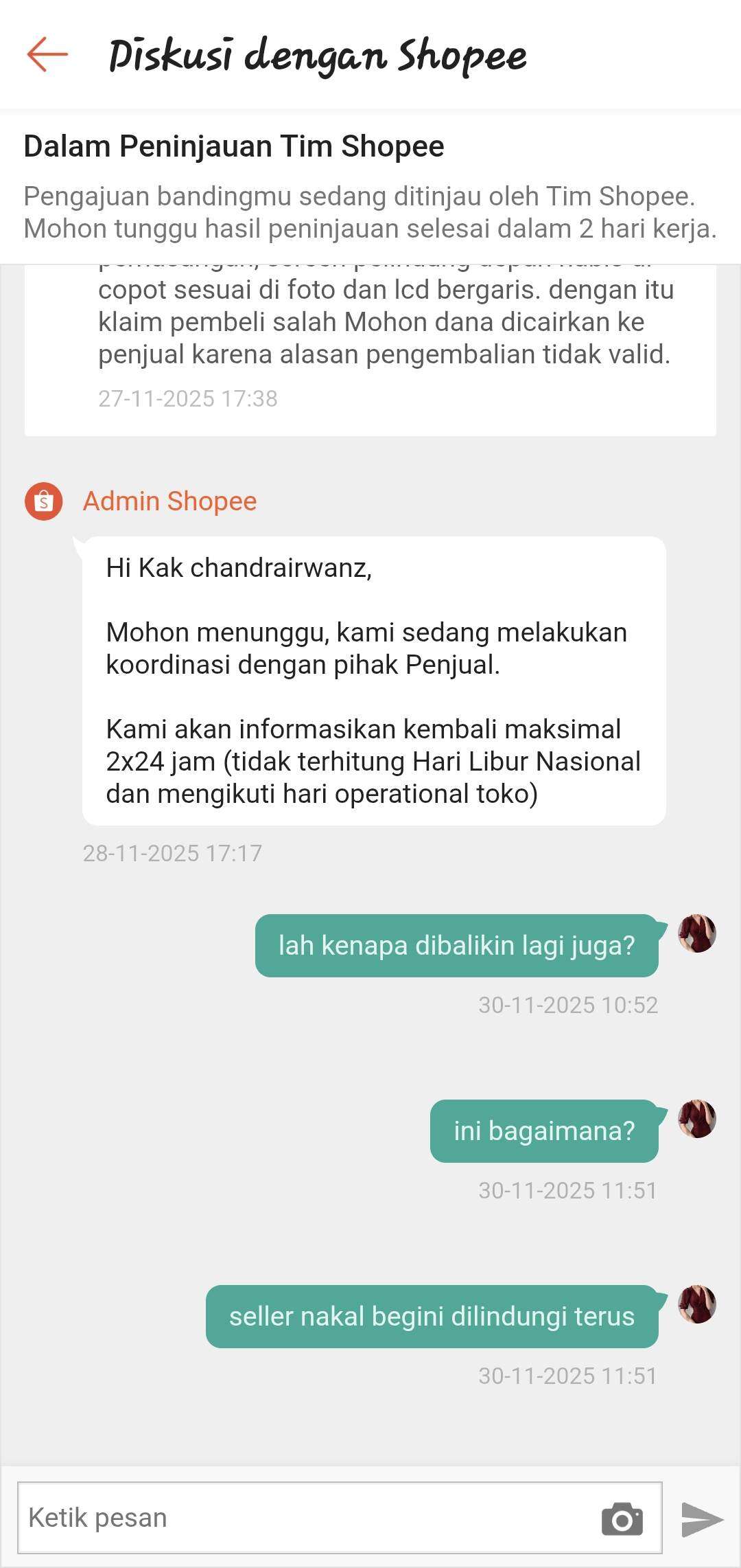 Saya mencoba menghubungi CS Shopee, tetapi jawabannya hanya teks standar tanpa tindak lanjut dan tanpa solusi. Shopee terlihat membela seller tanpa peduli terhadap konsumen yang dirugikan.