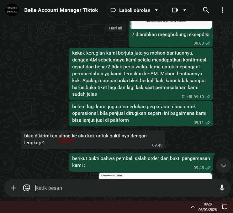 Sebagai penjual, kerugian yang kami alami tentu berdampak pada operasional dan perputaran usaha kami. Kami berharap pihak Tokopedia dapat memberikan perhatian serius dan menghadirkan penyelesaian yang adil atas permasalahan ini, mengingat sejak awal kami telah menyampaikan kronologi dan bukti dengan jelas, tetapi hingga saat ini belum ada solusi konkret, baik melalui penggantian kerugian maupun mendorong pihak ekspedisi untuk bertanggung jawab atas kerusakan paket yang terjadi.