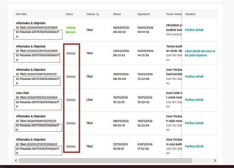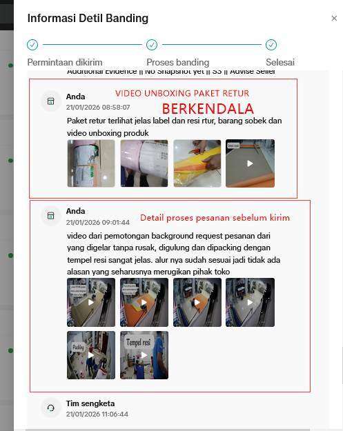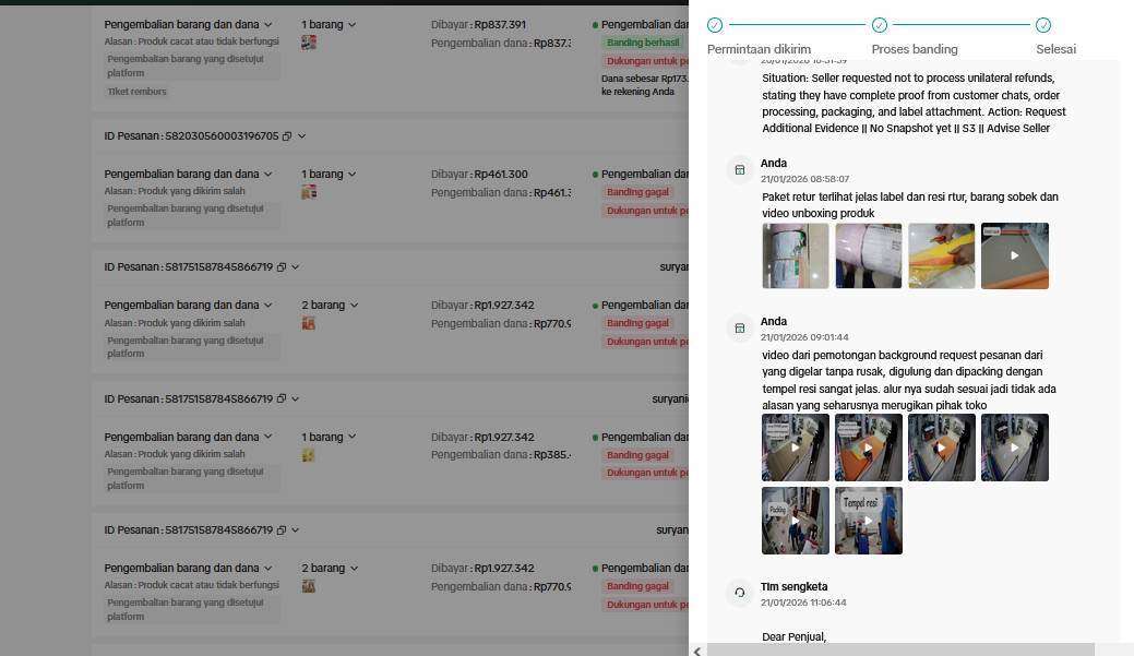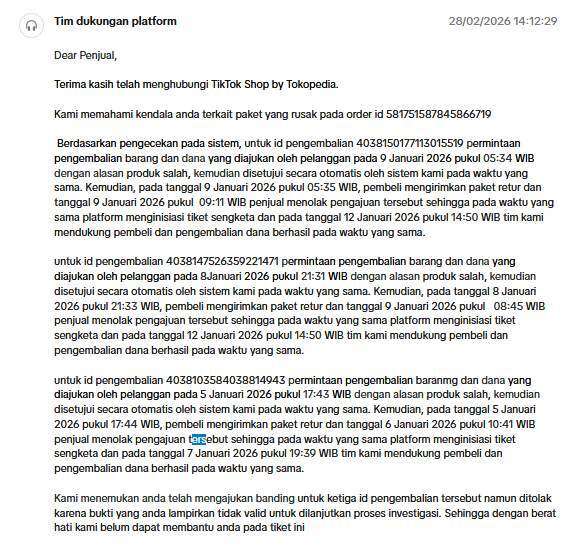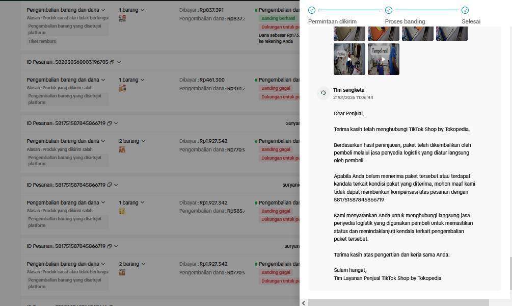 Pengajuan komplain tersebut telah dilakukan lebih dari lima kali. Pada tahap awal sengketa, keputusan platform sempat berpihak kepada penjual karena produk yang dikirim telah sesuai dengan pesanan dalam sistem. Namun, karena pembeli masih dapat mengajukan komplain hingga batas waktu tertentu, sengketa terus berlanjut hingga pada pengajuan terakhir keputusan justru mendukung pihak pembeli.