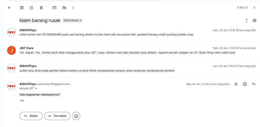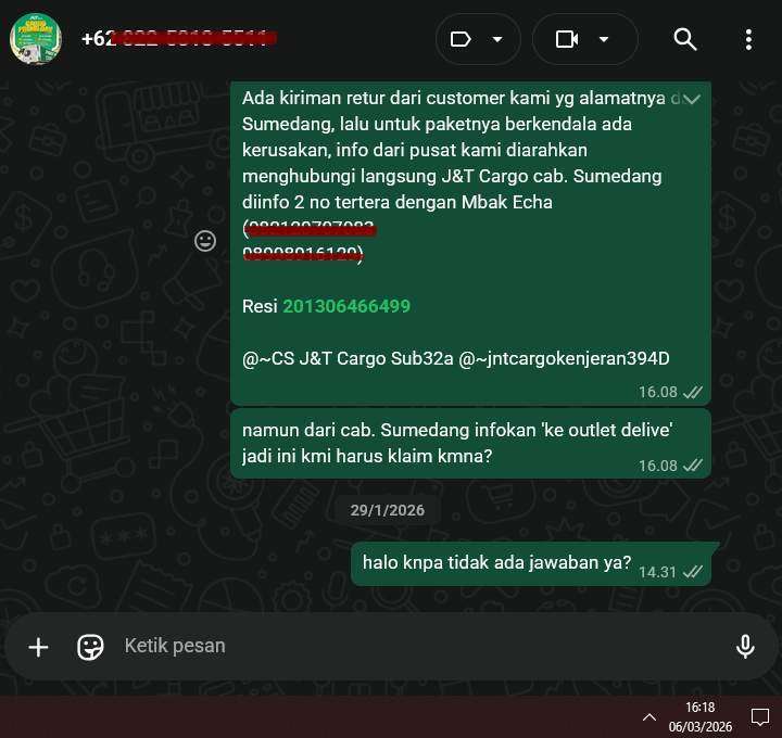 Kami telah berusaha menghubungi pihak J&T Cargo, mulai dari email, kantor cabang kurir pickup, kantor cabang di wilayah alamat pembeli, hingga pihak pengantar. Namun hingga saat ini, tidak ada tanggapan atau pertanggungjawaban terkait kerusakan paket tersebut.
