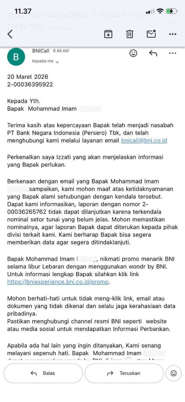 Saya kemudian membuat laporan melalui direct message Instagram BNI dan akhirnya diterima serta mendapat nomor laporan. Setelah menunggu, pada tanggal 20 Maret 2026 (Jumat), saya menerima email dari BNI yang menyatakan bahwa laporan saya tidak dapat dilanjutkan karena nominal setor tunai belum jelas.