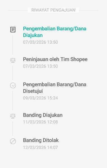 Pada tanggal 9 Maret 2026 Shopee menyetujui pengembalian dana tanpa pengembalian barang. Jadi barang saya tidak dikembalikan dan dana dikembalikan ke pembeli.