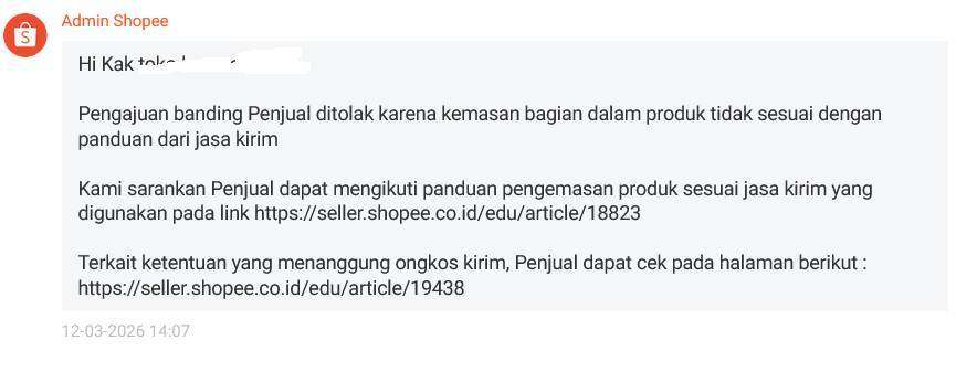 Tanggal 11 Maret 2026 saya mengajukan banding dan tanggal 12 Maret 2026 banding saya ditolak dengan alasan pengemasan tidak sesuai standar.