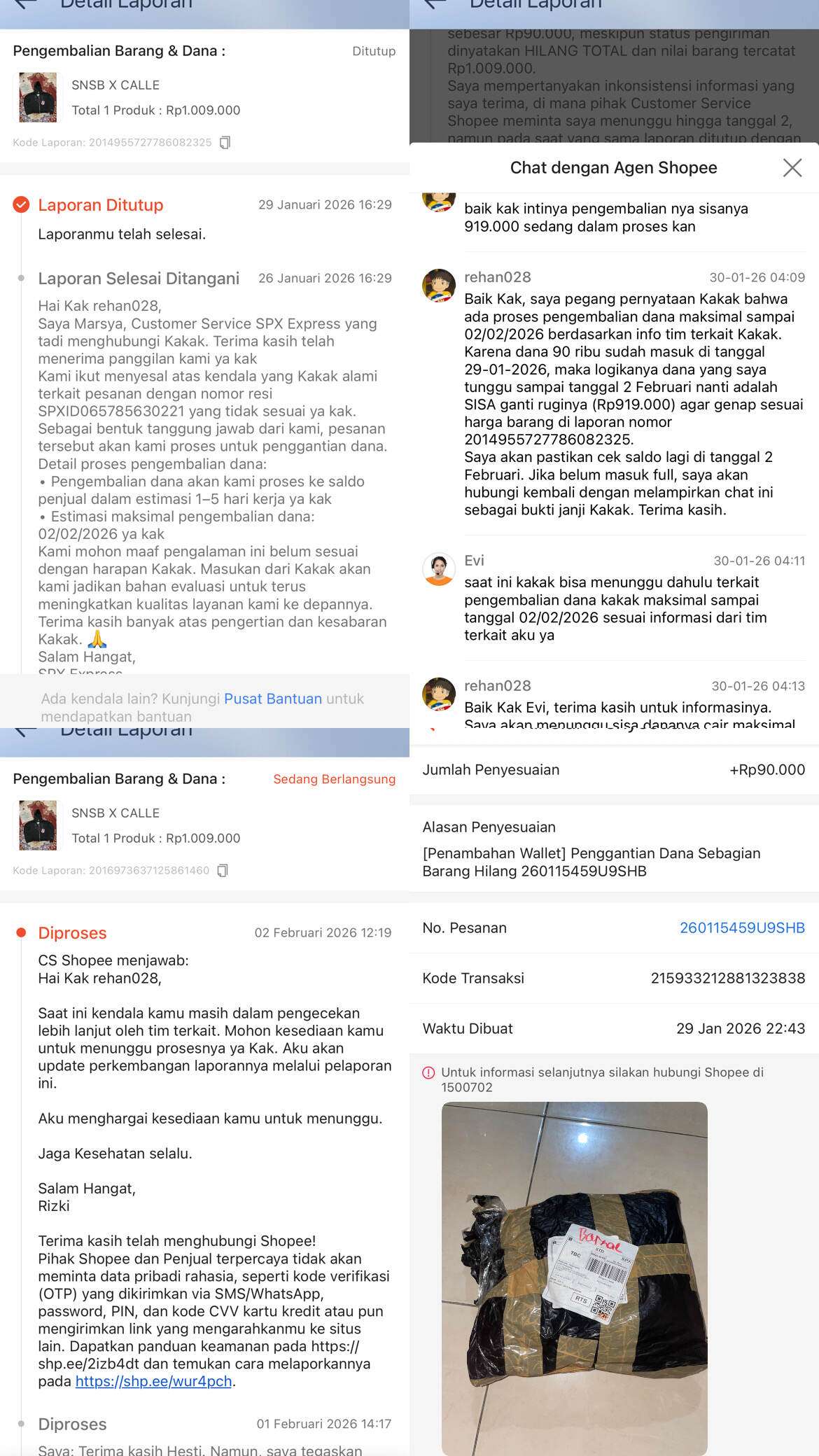 Total harga barang adalah Rp1.009.000, tapi Shopee secara sepihak hanya mencairkan Rp90.000, yang berarti sisa dana saya sebesar Rp919.000 masih ditahan tanpa alasan yang jelas. Dalam percakapan sebelumnya dengan CS (Ma****, E**, Ri***), Shopee memberikan janji tertulis bahwa masalah ini akan diselesaikan dan dana akan cair paling lambat pada 2 Februari 2026.