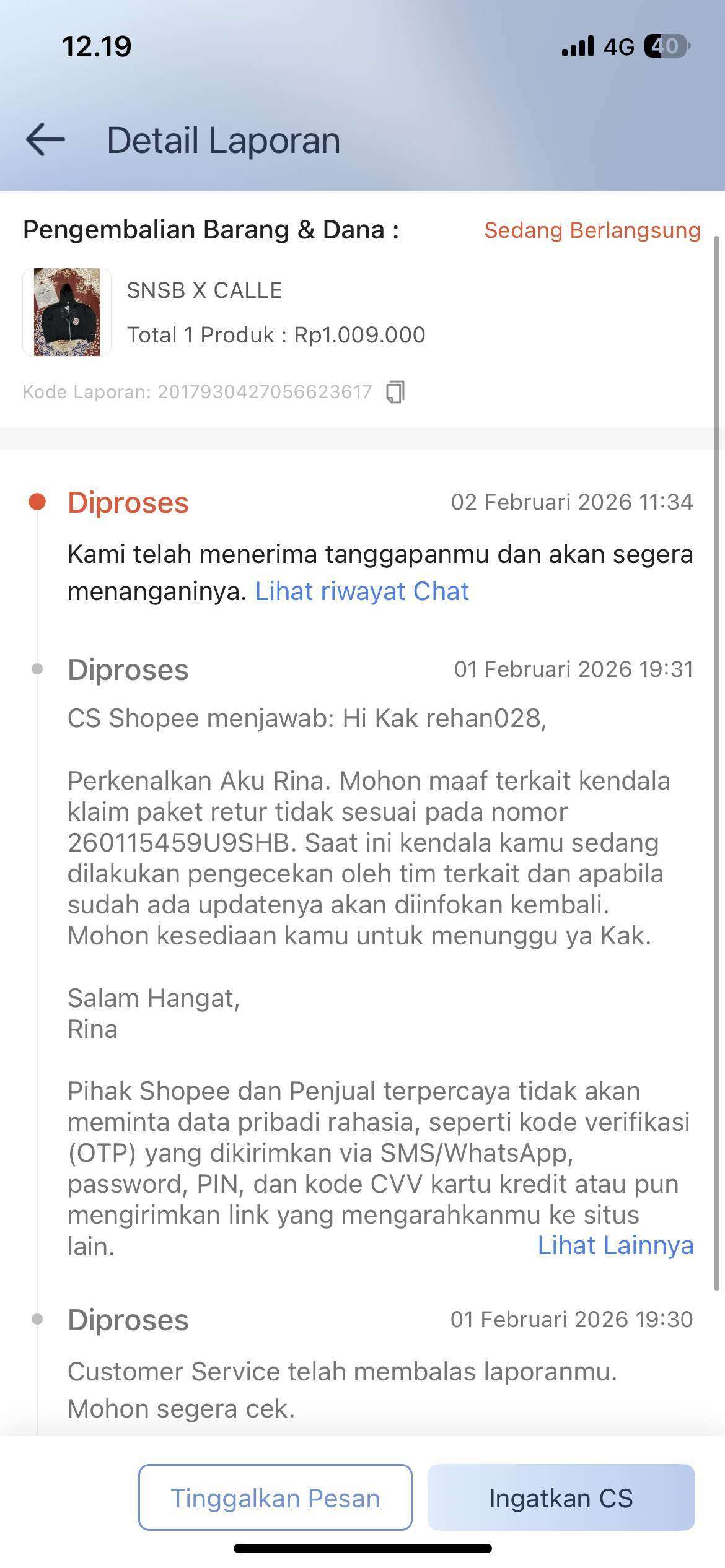 Pada tanggal 26 Januari 2026, saya menerima paket retur yang dalam kondisi rusak parah/jebol (diduga dibobol saat proses pengiriman logistik Shopee). Saya segera mengajukan klaim dengan nomor laporan: 2017930427056623617.