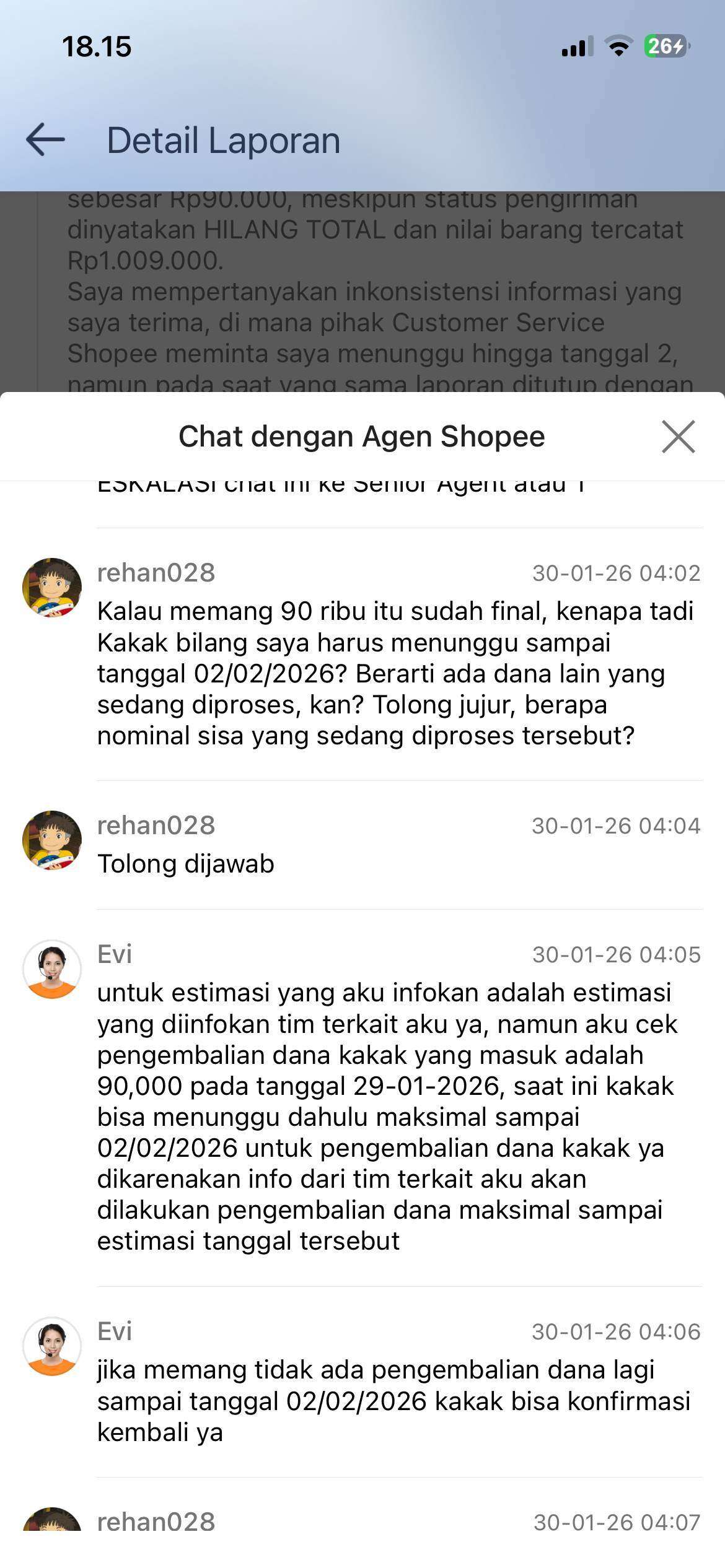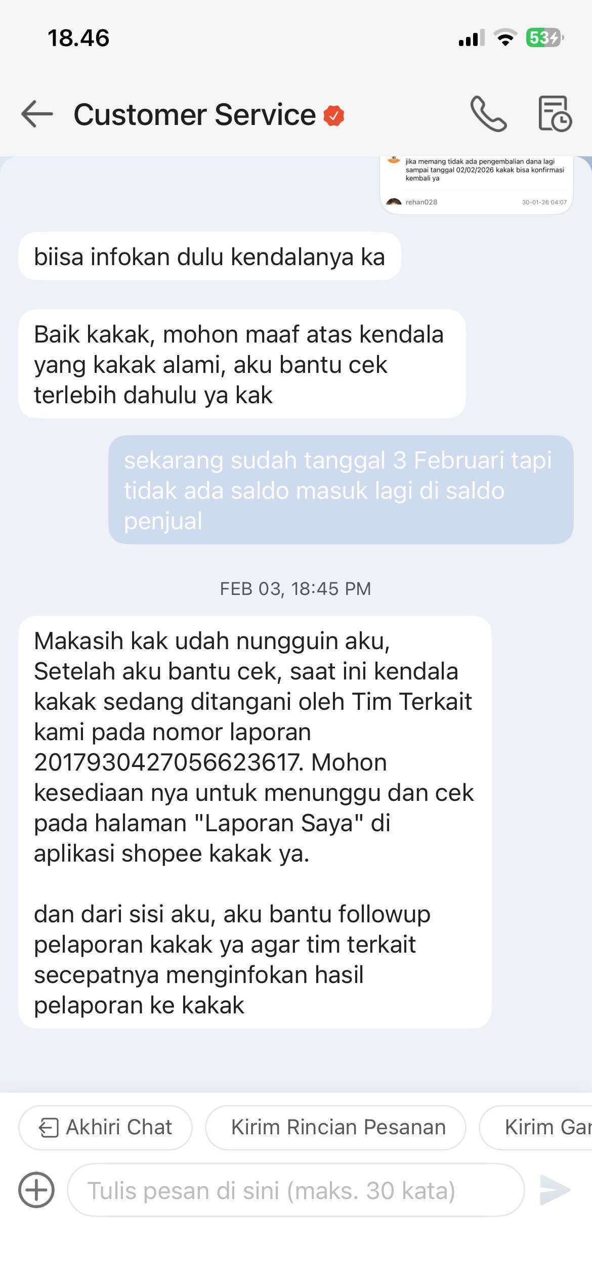 Namun hingga hari tanggal 4 Februari 2026, janji tersebut tidak ditepati. Pihak Shopee telah melakukan wanprestasi. Ketika saya menagih janji melalui live chat, CS (agen Sal******) justru memberikan jawaban template yang tidak solutif dan bahkan mengakhiri chat secara sepihak.