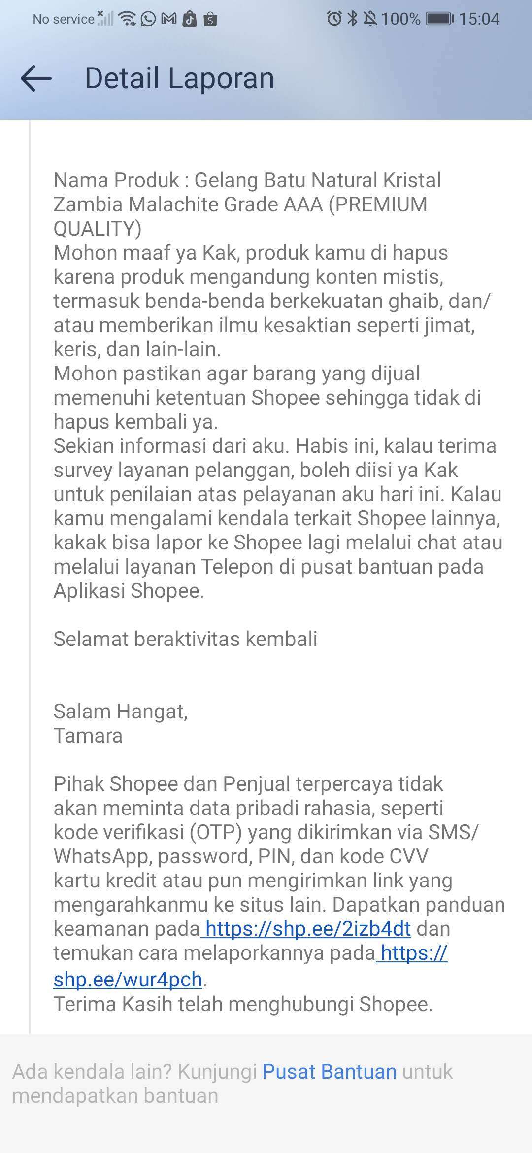 Pada tanggal 28 Januari 2026, saya melakukan pengeditan pada produk saya yang berjudul “Gelang Batu Natural Kristal Zambia Malachite Grade AAA (PREMIUM QUALITY)”. Tiba-tiba, saya menerima laporan dari Shopee bahwa produk tersebut dihapus karena dianggap terindikasi sebagai produk mistis.