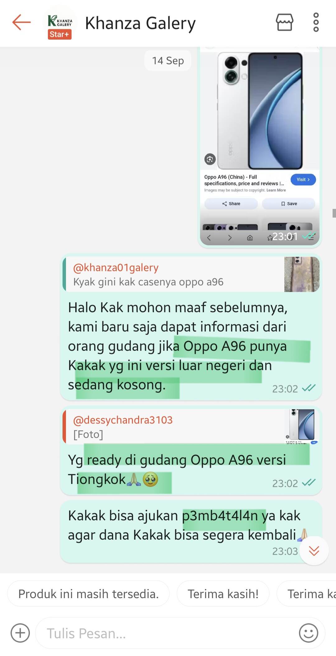 Kami kemudian menghubungi pembeli melalui chat dan menjelaskan bahwa pesanan pembeli kosong serta meminta pembeli mengajukan pembatalan. Namun anehnya, pembeli bukannya mengajukan pembatalan, malah meminta saya memesan dan mengirimkan case Oppo A96 China version, serta bertanya apakah case tersebut akan cocok dengan Oppo A96 versi global.