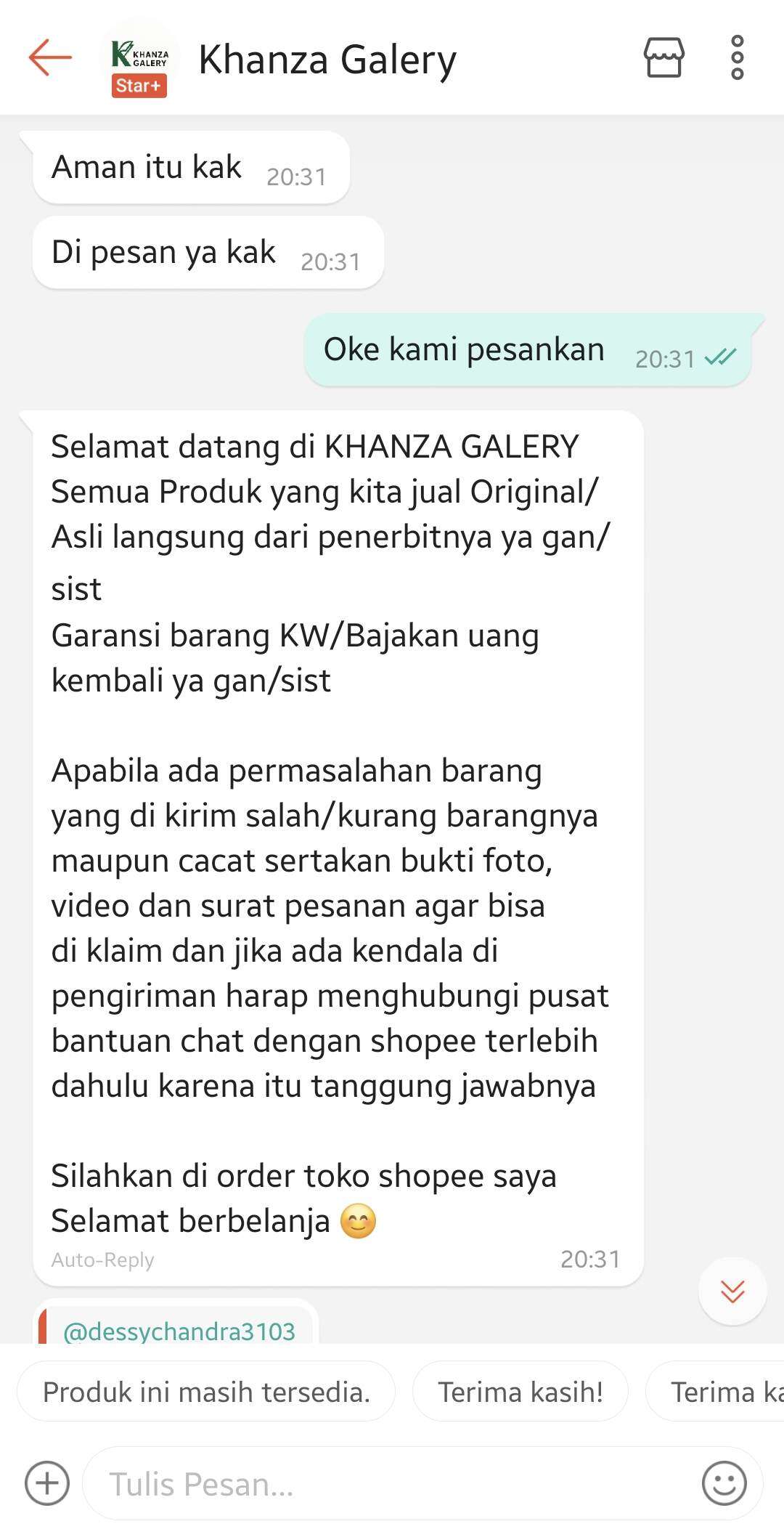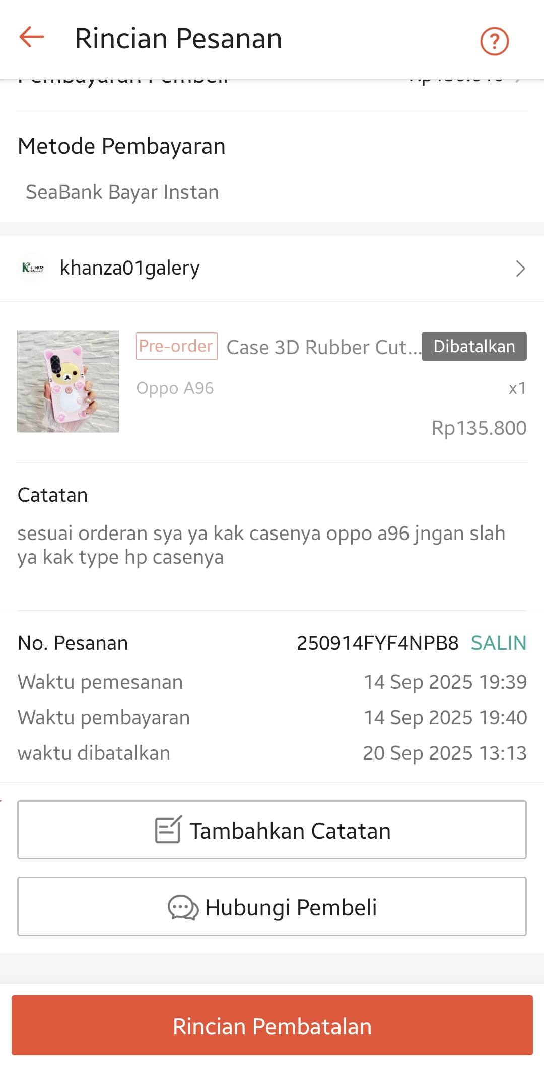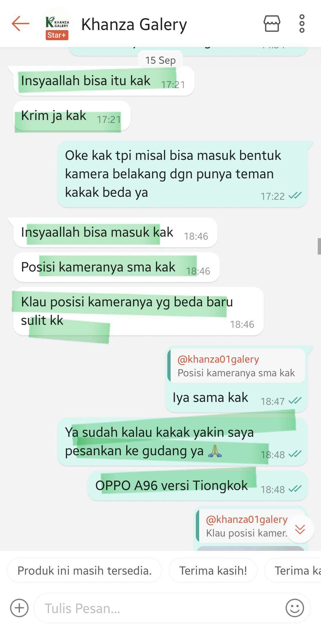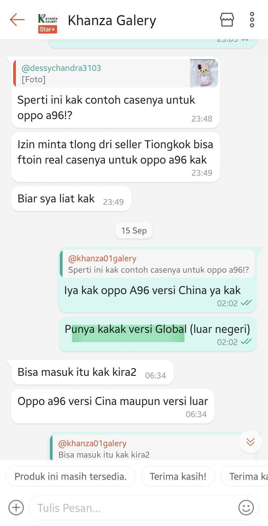 Kasus saya dimulai pada tanggal 12 September 2025, di mana username Khanza01galery yang juga merupakan toko dengan status Star+ melakukan checkout (CO) case 3D Rubber Cute Rilakkuma Pink untuk tipe Oppo A96. Setelah saya cek di gudang Tiongkok (barang pre-order dari sana), pihak gudang Tiongkok mengatakan bahwa Oppo A96 versi global (versi Indonesia) kosong dan yang tersedia hanya Oppo A96 China version.