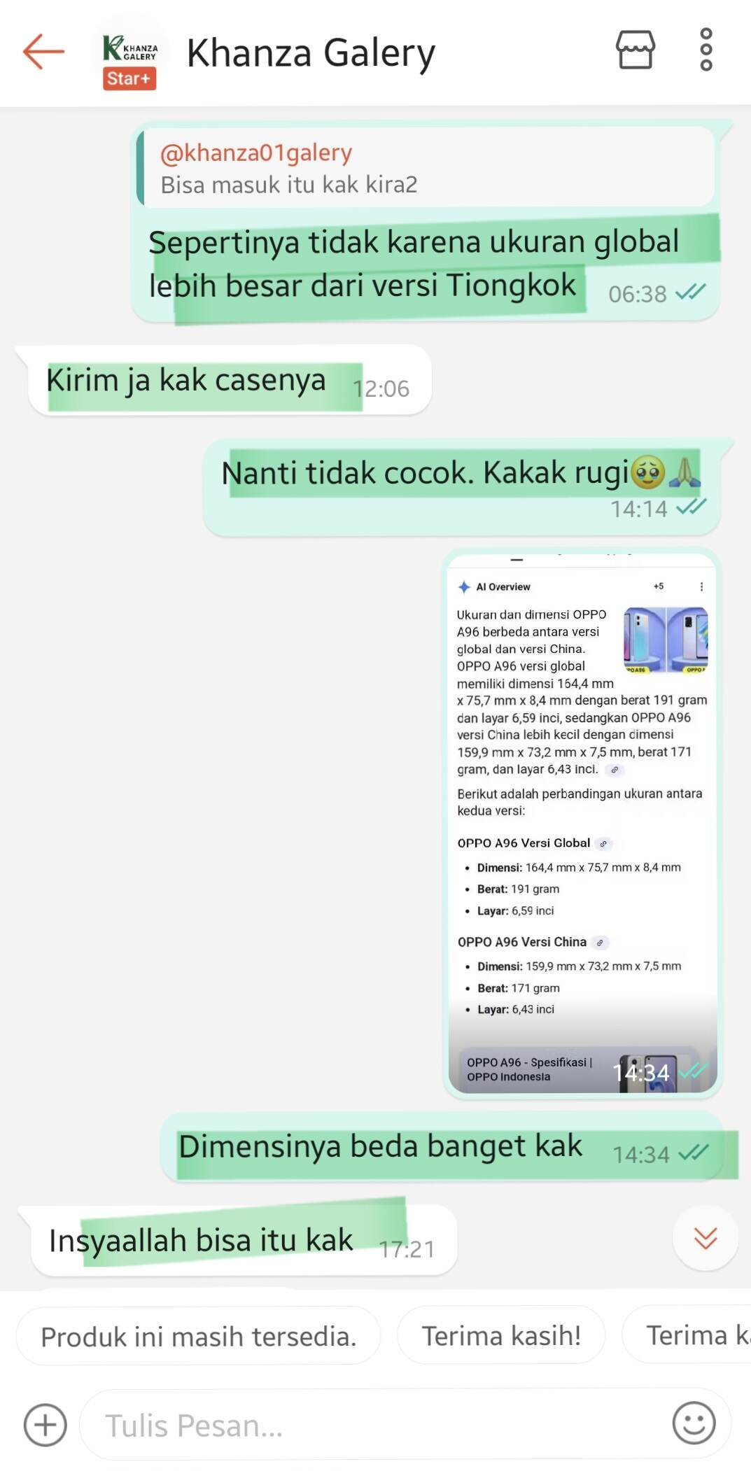 Kami sudah menjelaskan bahwa case tersebut tidak mungkin cocok karena perbedaan dimensi yang cukup besar di antara keduanya. Kami juga melampirkan screenshot perbedaan dimensi kedua produk melalui chat. Namun setelah itu, pembeli berulang kali menyatakan bahwa case Oppo A96 China version akan cocok di handphone-nya.