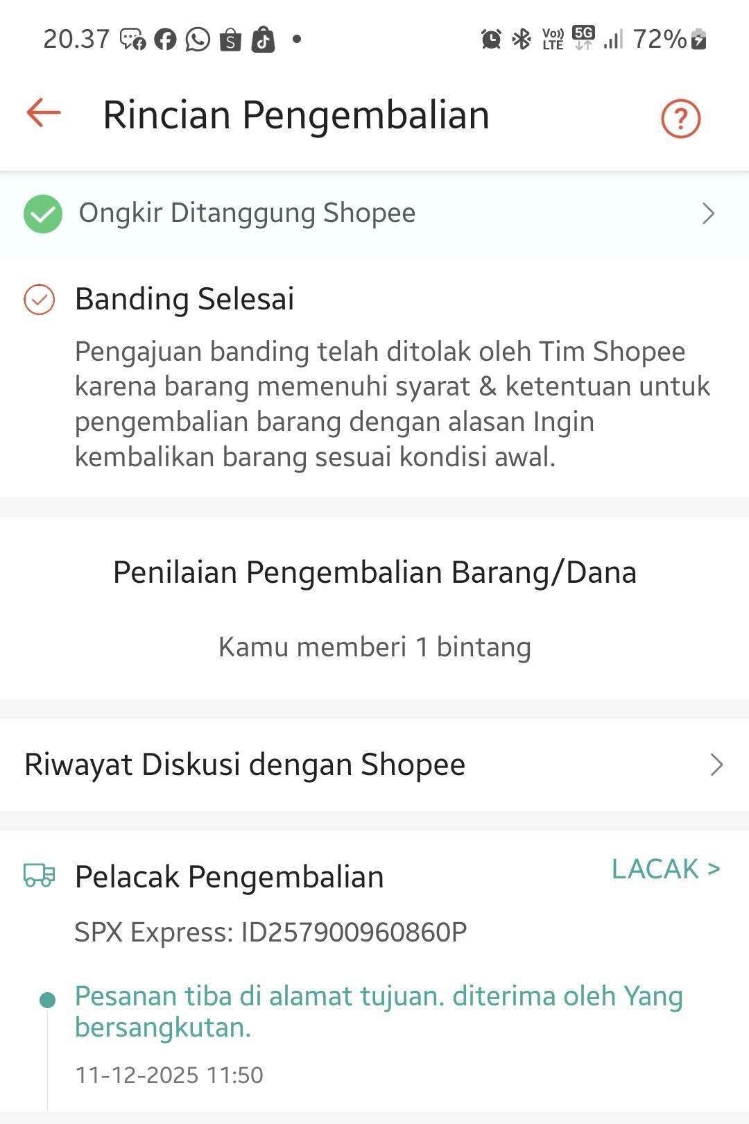 Akhirnya, dana dikembalikan pada tanggal 1 Desember 2025 dengan pengiriman retur menggunakan kurir SPX Express dengan nomor resi ID257900960860P. Saat customer service yang kami hubungi, mereka sempat keceplosan mengira kami sebagai pembeli yang menanyakan dana pengembalian.