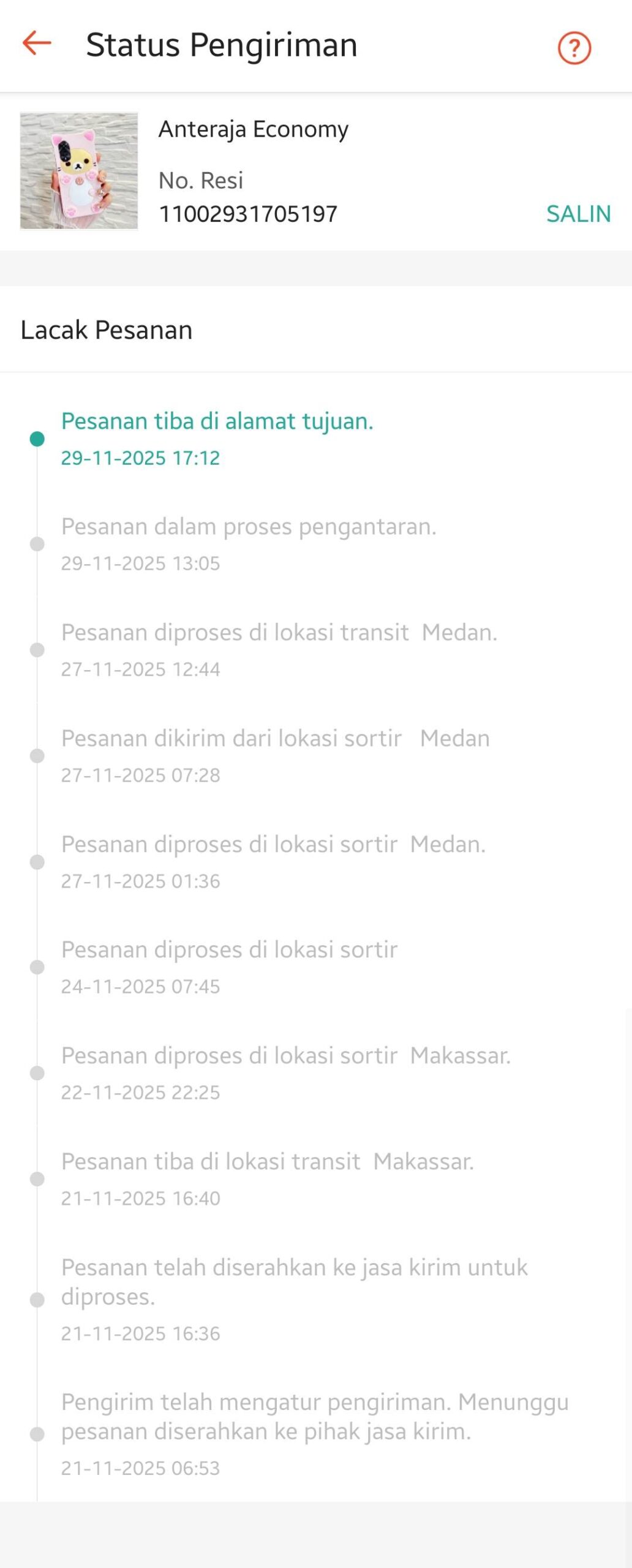 Pembeli melakukan dua kali checkout karena barang tiba lebih lama. Checkout kedua dilakukan pada tanggal 20 November 2025. Kami mengirim pesanan pada tanggal 21 November 2025 menggunakan kurir Anter Aja Economy dengan nomor resi 11002931705197. Pesanan tiba pada tanggal 29 November 2025.