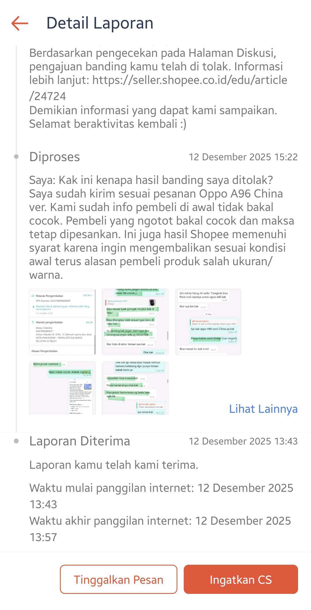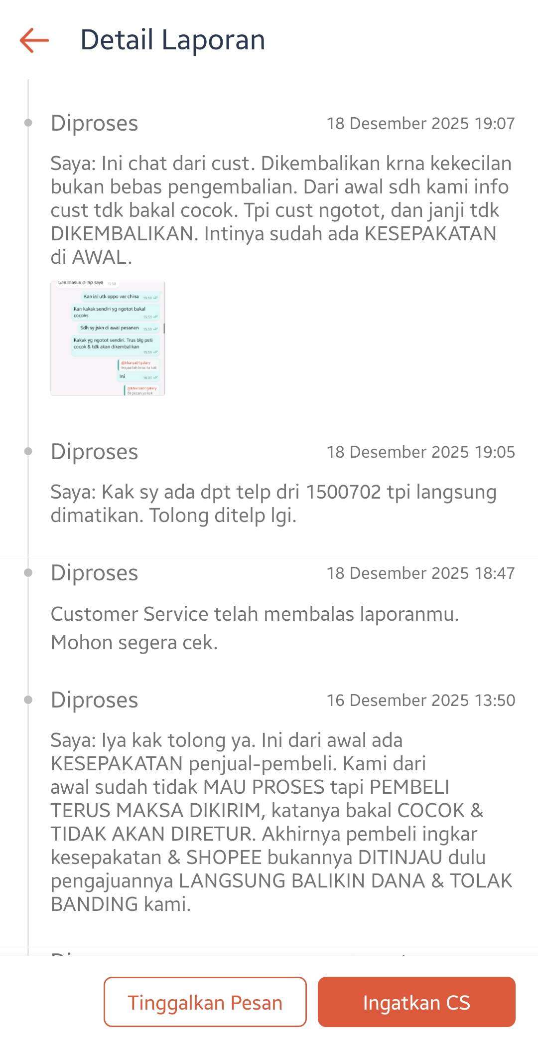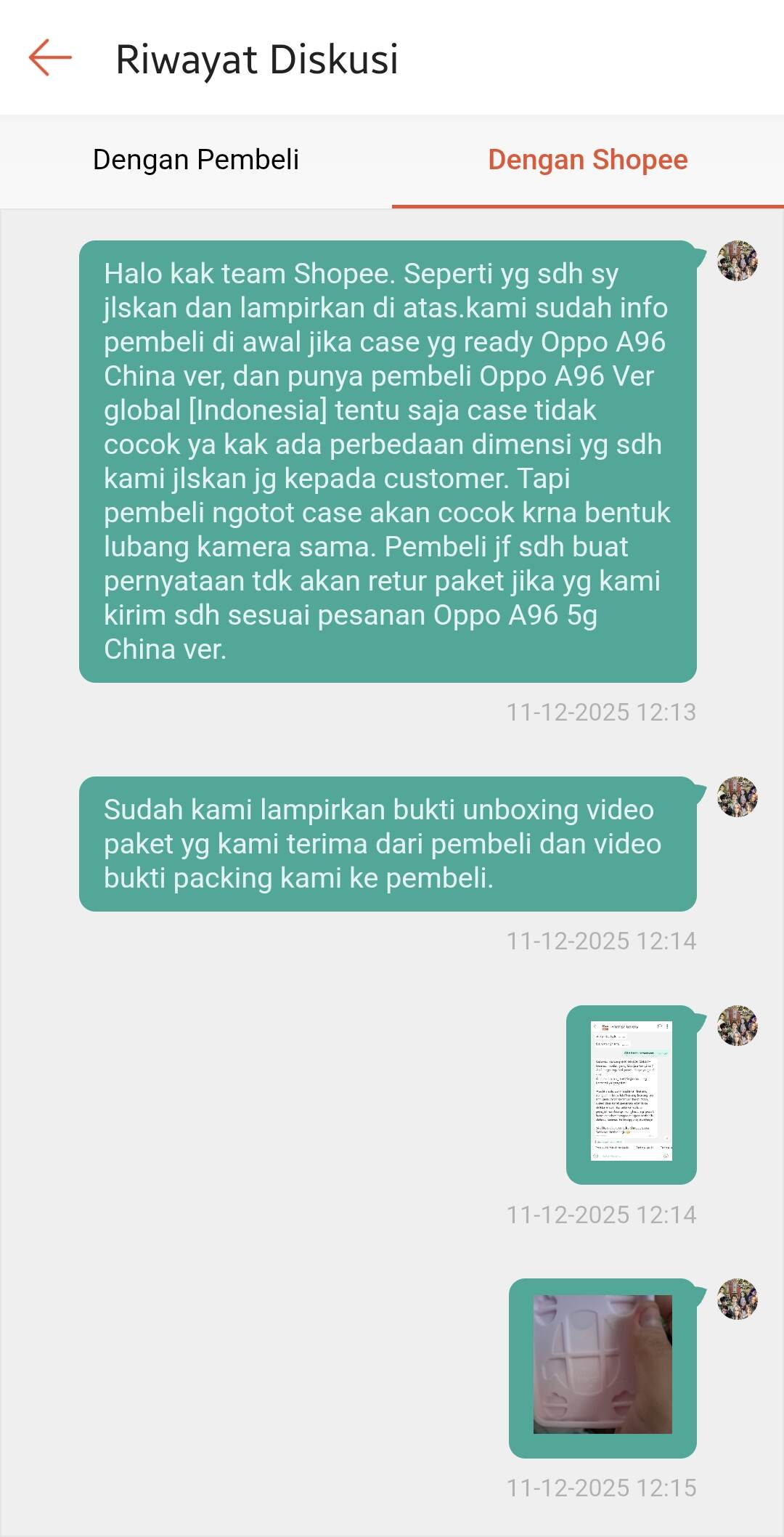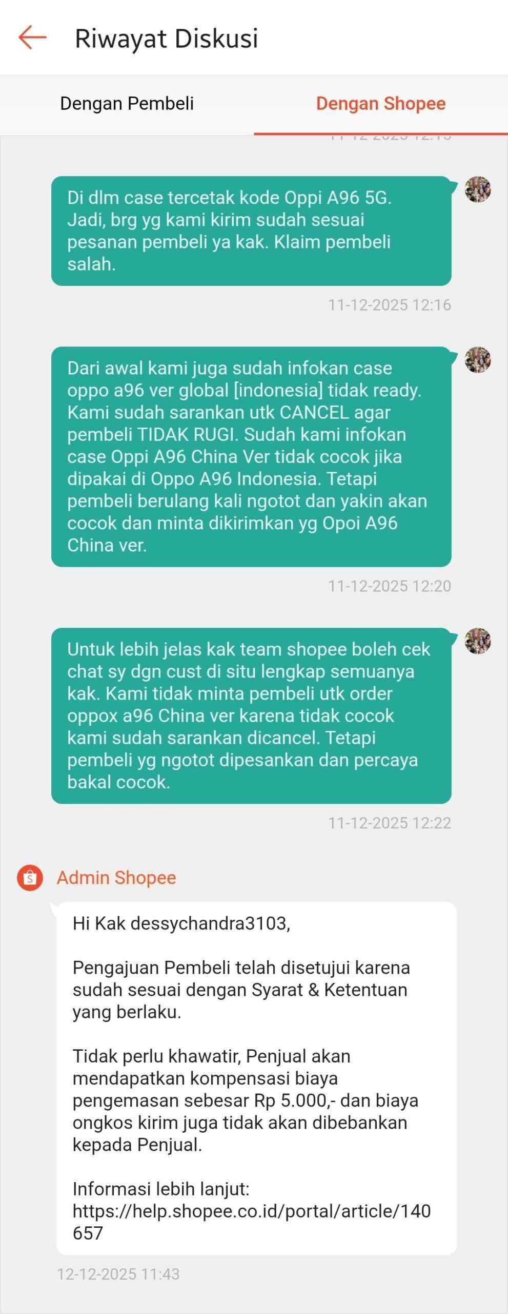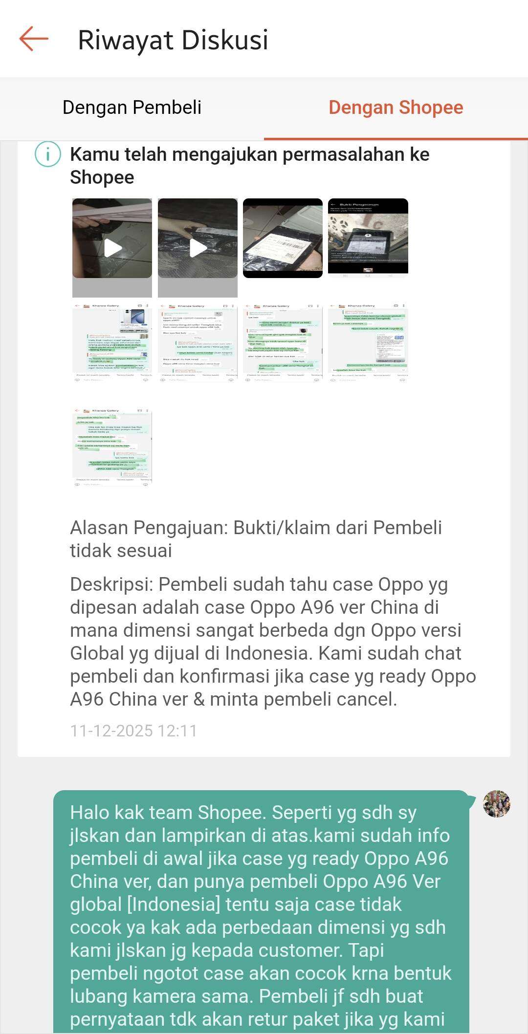 Pada tanggal 11 Desember 2025, kami menerima paket retur tersebut dan saya langsung mengajukan banding dengan menyertakan video unboxing saat paket kami terima, video packing saat kami mengirim barang, bukti chat kesepakatan di awal, serta bukti chat pembeli yang bersikeras meminta barang dikirim karena opini pribadinya bahwa barang akan cocok.