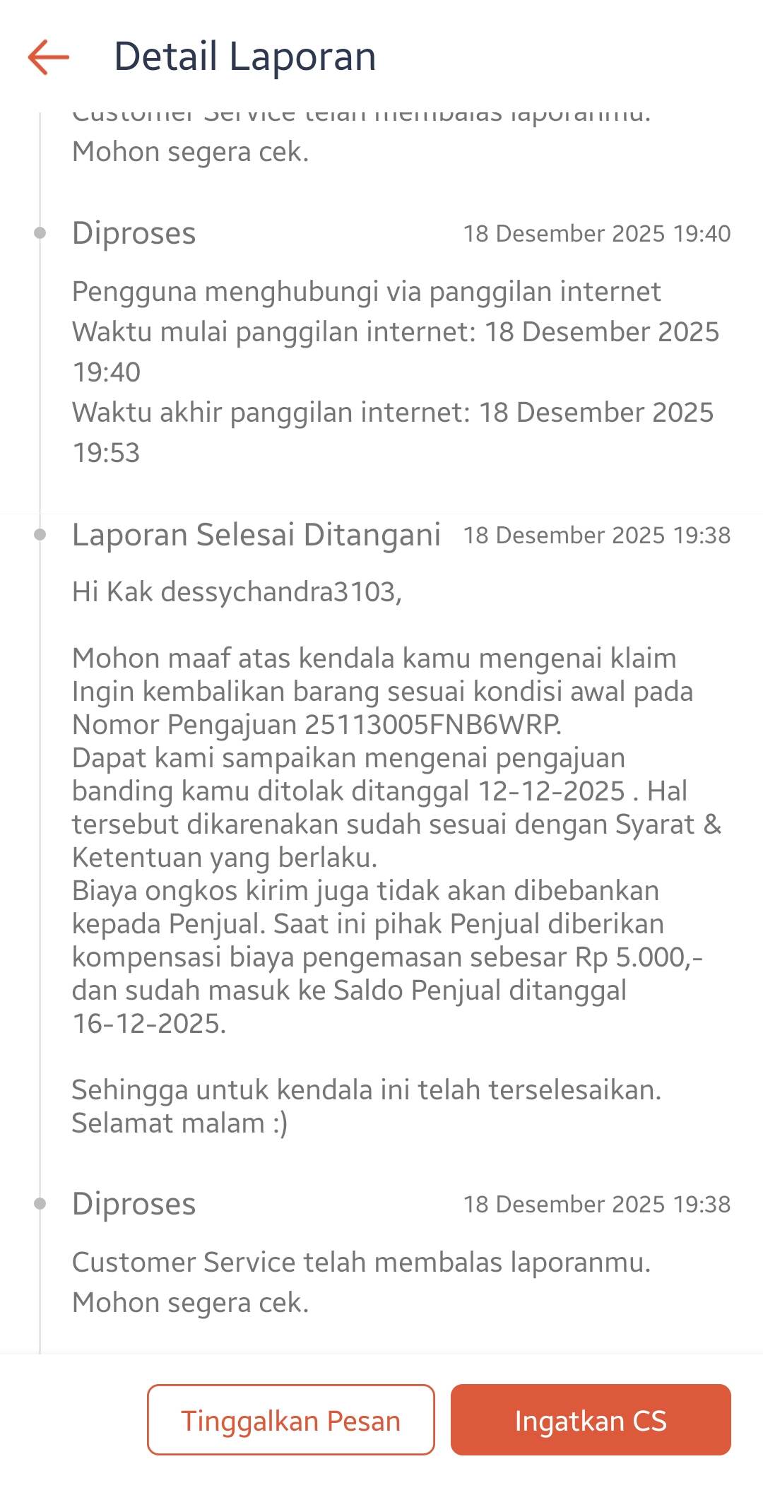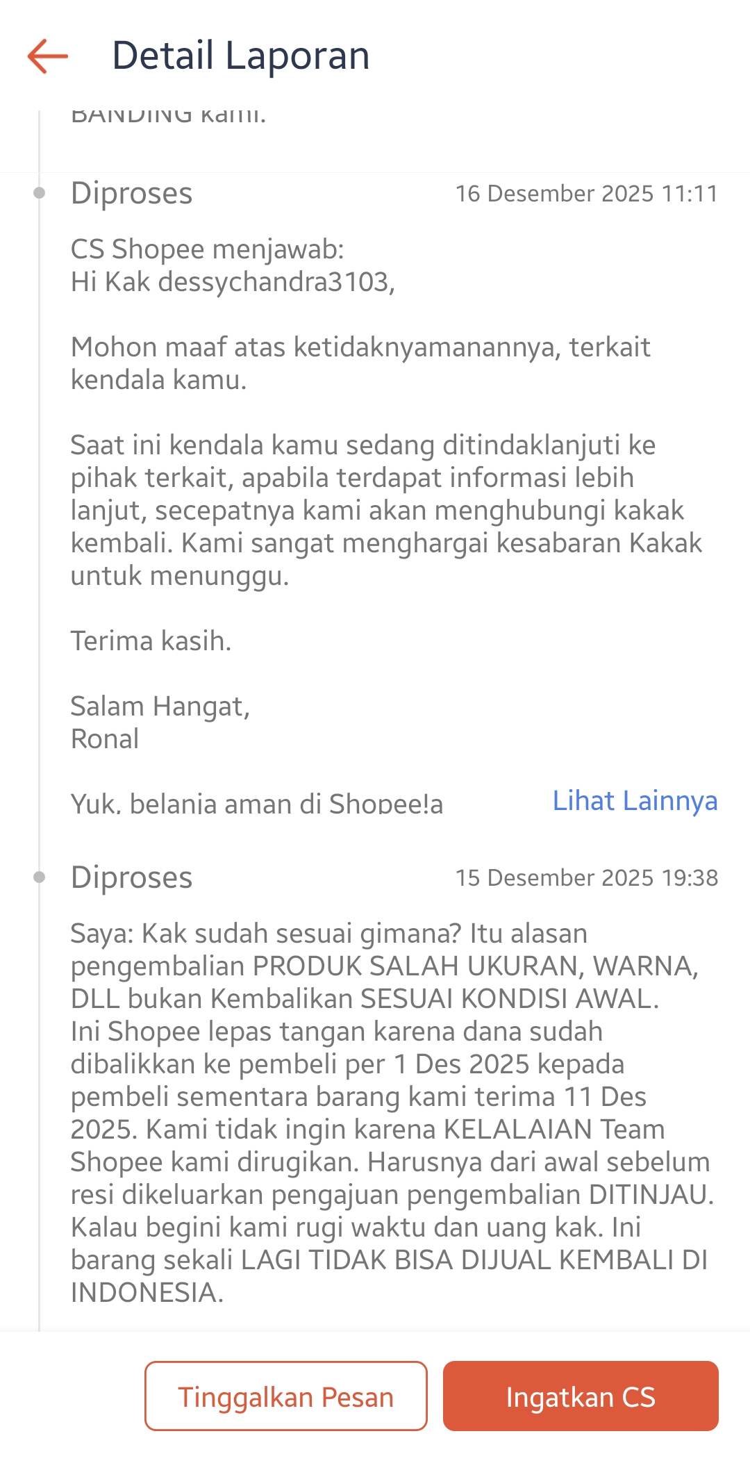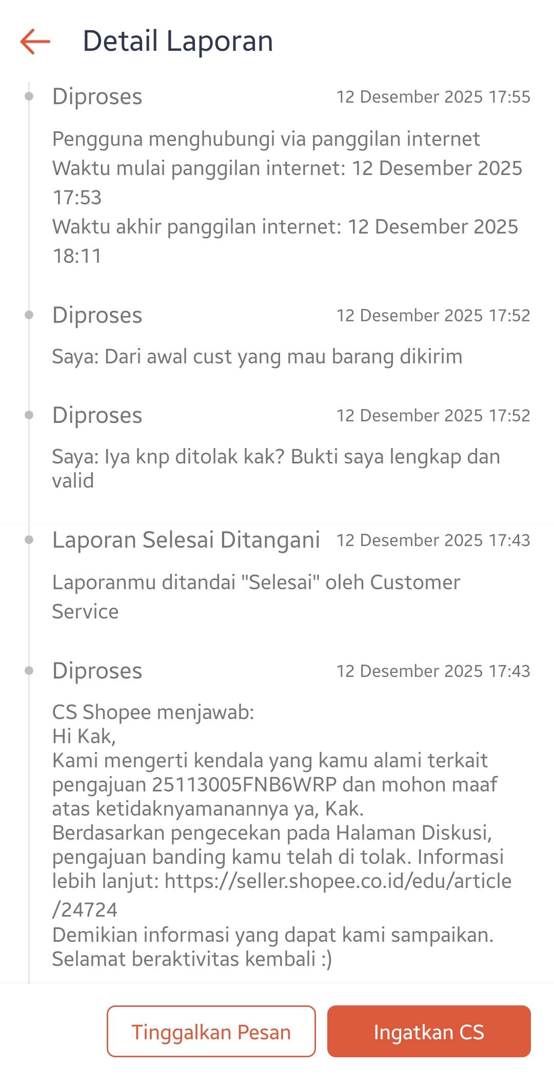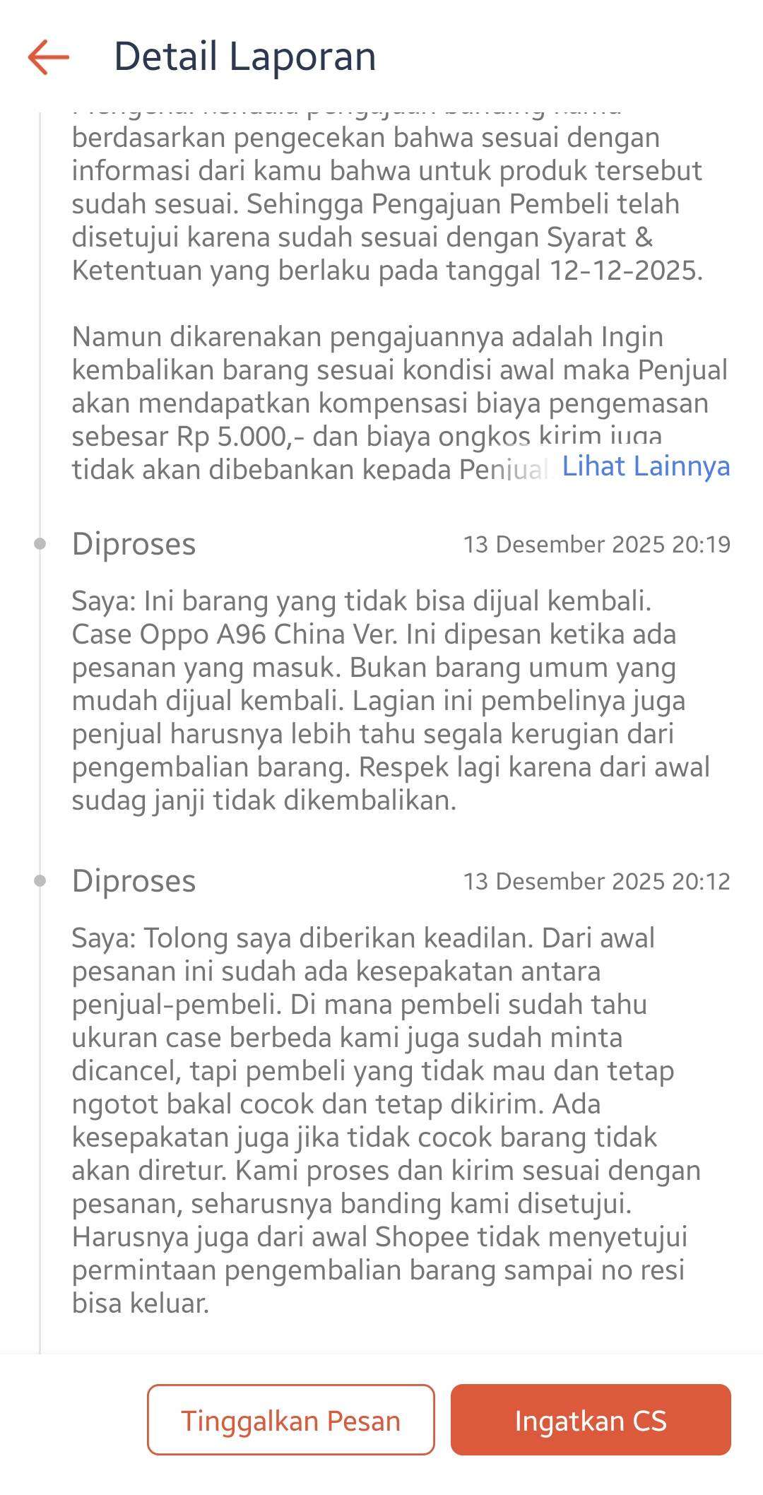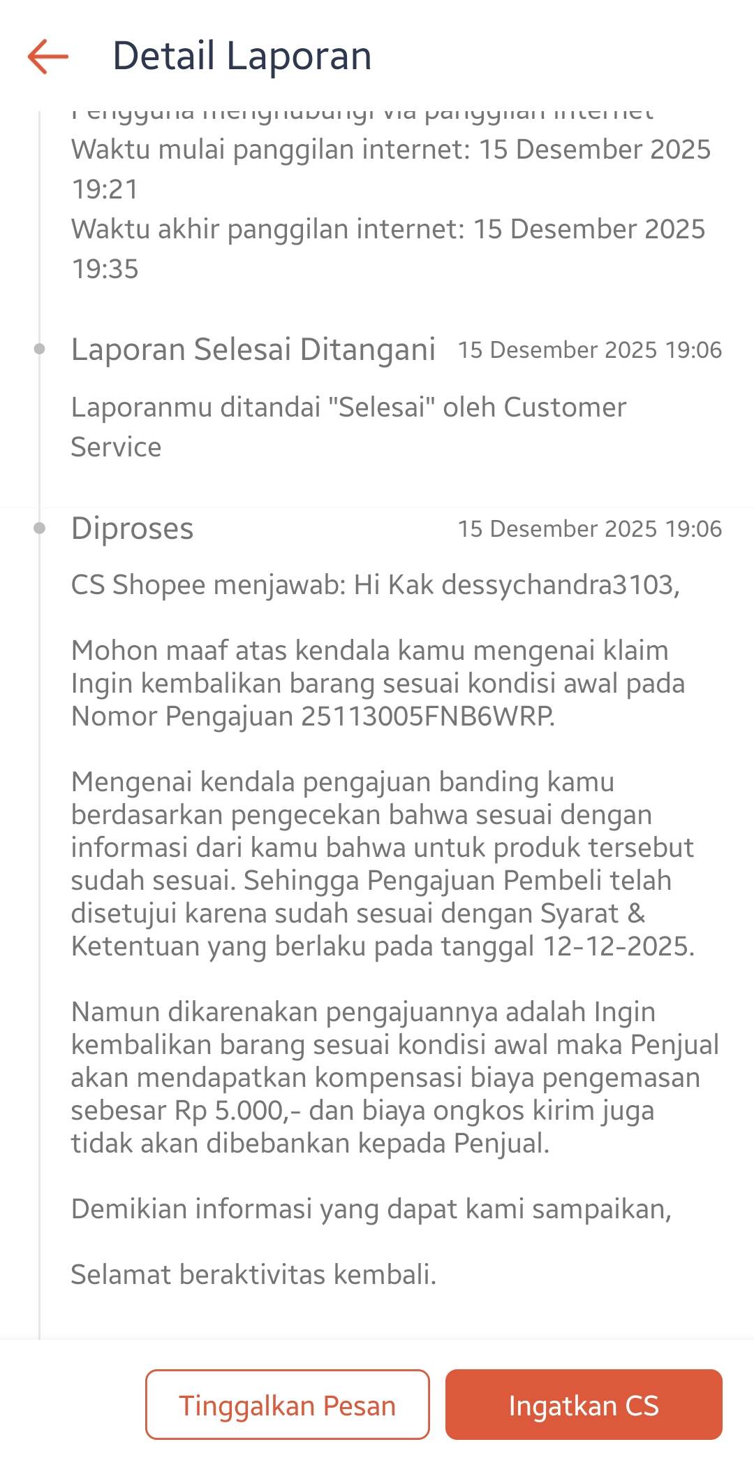 Pada tanggal 12 Desember 2025, Shopee menolak banding saya dengan alasan pengembalian sesuai S&K, di mana pembeli berhak mengembalikan barang sesuai kondisi awal. Alasan pengajuan pembeli adalah produk salah ukuran atau warna. Shopee hanya memberikan kompensasi sebesar Rp5.000, yang kemudian dipotong Rp350, sehingga total yang saya terima hanya Rp4.650. Saya kemudian membuat tiket pelaporan dengan kode pelaporan 1999354375849287767.