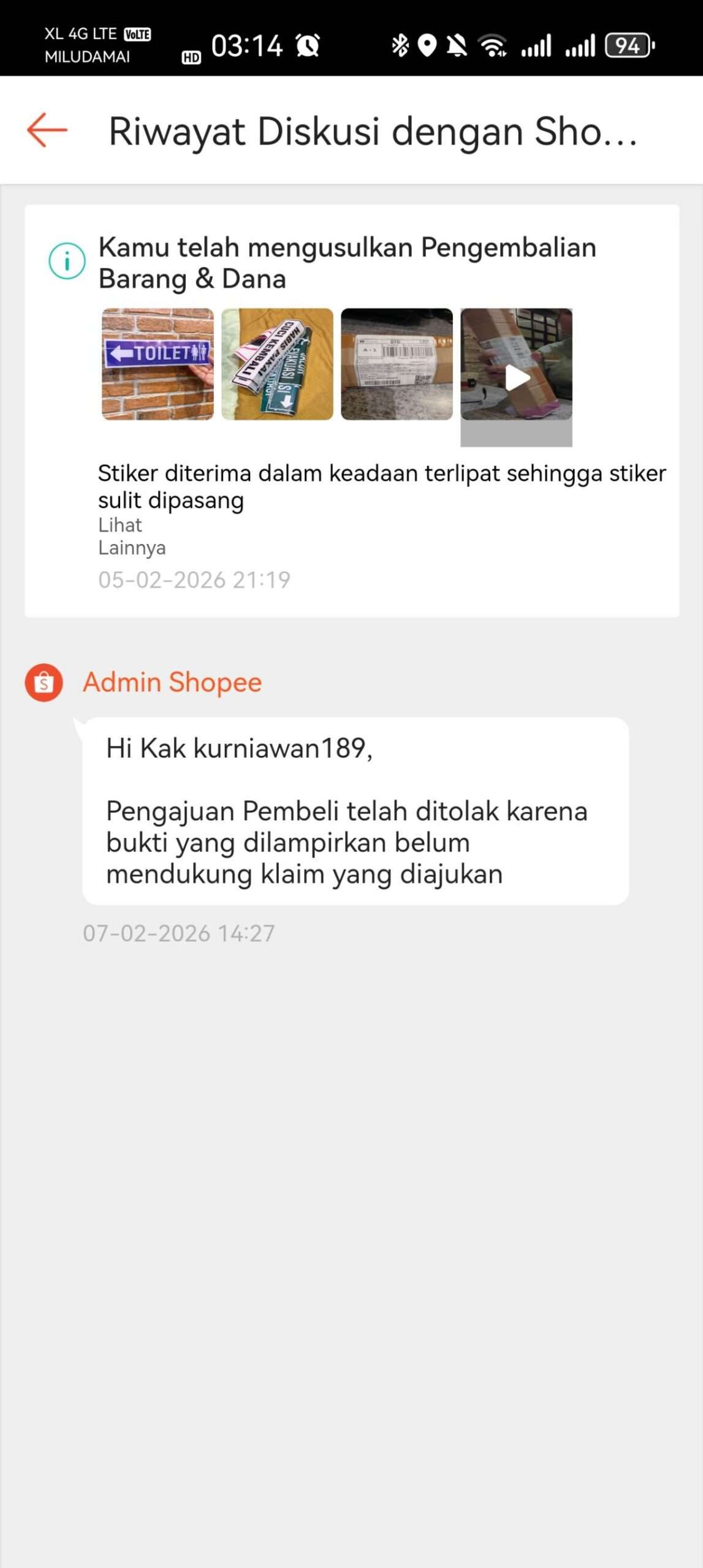 Produk yang saya terima memiliki kualitas buruk, yaitu stiker cetakan berkualitas rendah dan dikirim dalam kondisi terlipat sehingga sulit untuk ditempel. Oleh karena itu, saya mengajukan pengembalian sesuai prosedur. Namun pengajuan tersebut ditolak oleh Tim Mediasi Shopee dengan No. 260117A11GQNGH dengan alasan bukti tidak valid menggunakan template yang sering kali digunakan tanpa memberi penjelasan ketidakvalidannya di mana.