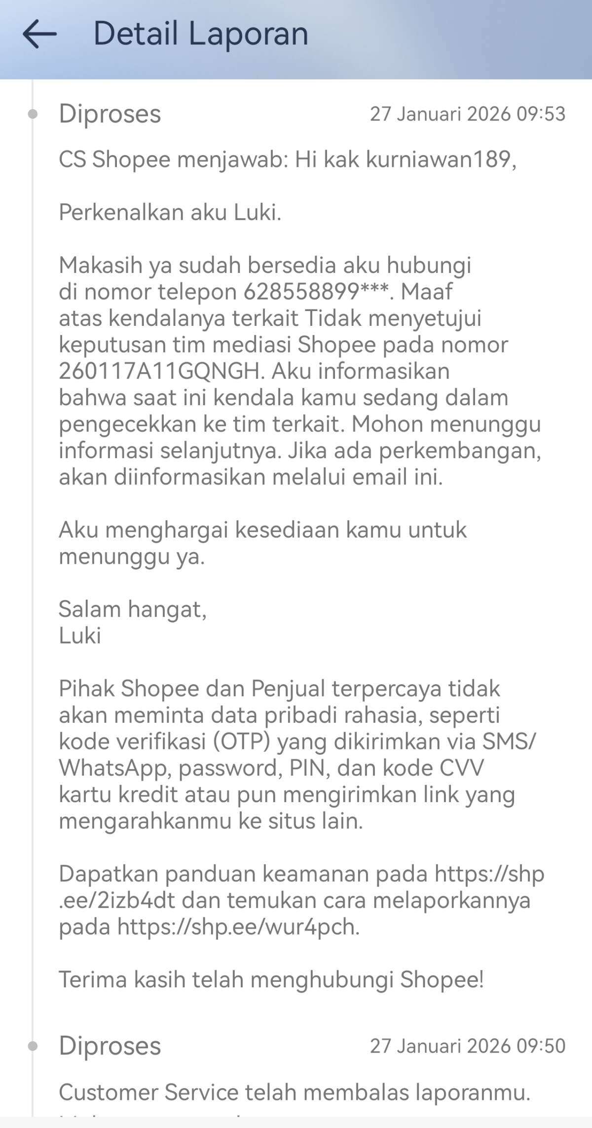 Pengalaman ini menunjukkan lemahnya respons layanan pelanggan serta tidak transparannya proses mediasi di Shopee. Kondisi ini patut menjadi perhatian serius bagi manajemen Shopee untuk memperbaiki kualitas layanan Tim Mediasi dan customer service agar konsumen memperoleh kepastian, keadilan, dan tanggapan yang profesional.