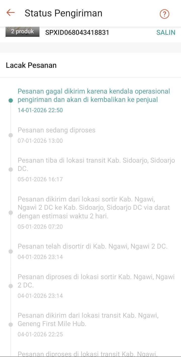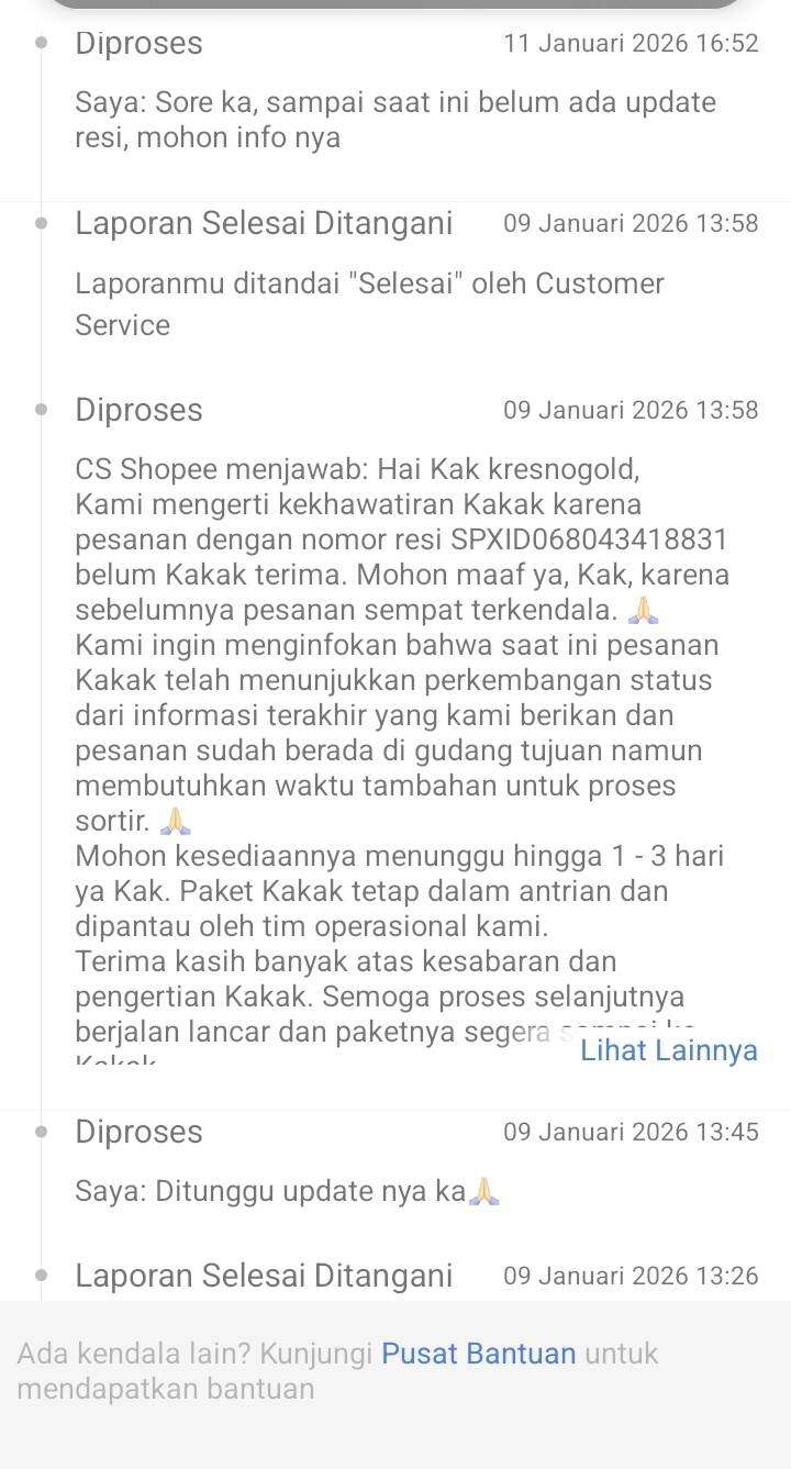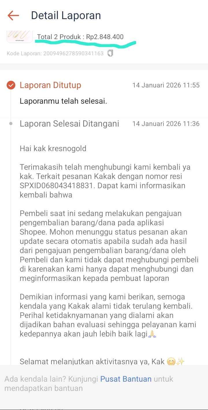 Kami telah mengajukan laporan pada tanggal 9 Januari 2026 dan diberi tahu untuk menunggu 1-3 hari. Namun, seperti yang dapat dilihat di status paket, hingga hari ini tidak ada update lagi. Pengembalian dana kepada pembeli sudah diproses, tetapi tidak ada kejelasan mengenai pengembalian barang kepada penjual.