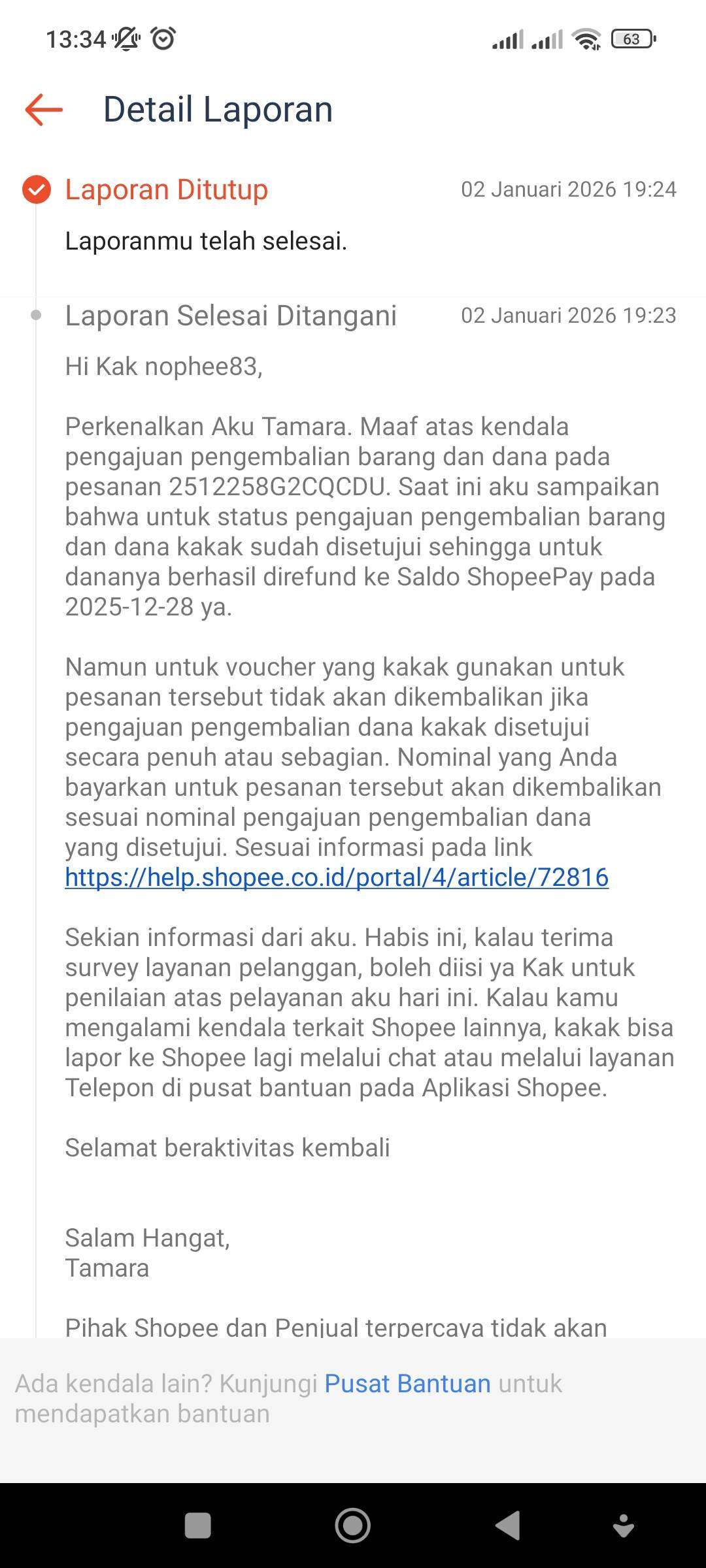 Selanjutnya, saya melakukan retur barang ke penjual dengan nomor transaksi 2512270FTQ6SM1F. Tidak berapa lama, transaksi retur dinyatakan selesai dan pengembalian dana masuk ke saldo ShopeePay saya setelah dipotong nominal voucher yang saya gunakan. Karena voucher tidak dikembalikan, saya kembali menghubungi CS Shopee dan mendapatkan nomor laporan 2005537478497558547.