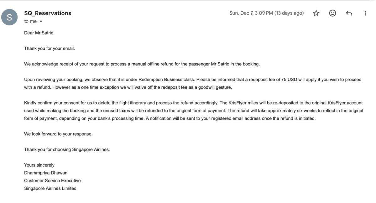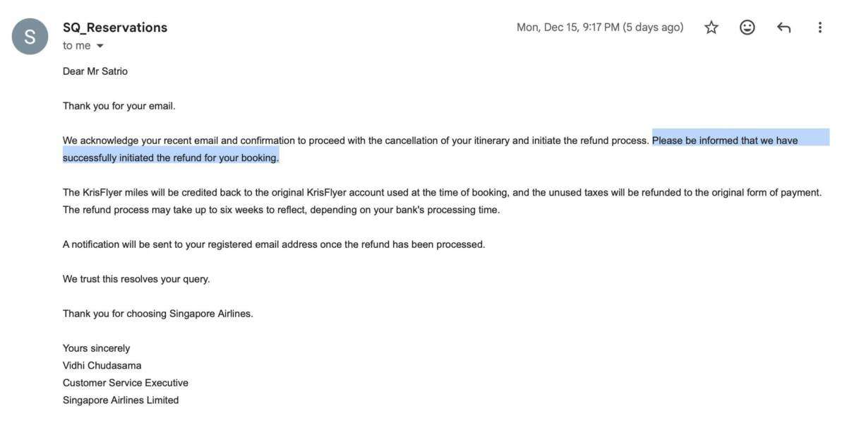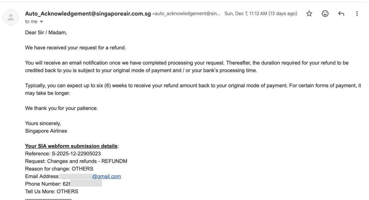 Hingga sekarang, saya tidak menerima tanggapan dari Singapore Airlines maupun kejelasan apakah proses refund telah benar-benar dimulai atau masih menggantung, serta apakah informasi yang diminta sudah mencukupi atau belum. Saya mencoba mengirimkan email kembali pada tanggal 19 Desember dan 20 Desember, tetapi tidak mendapatkan jawaban.