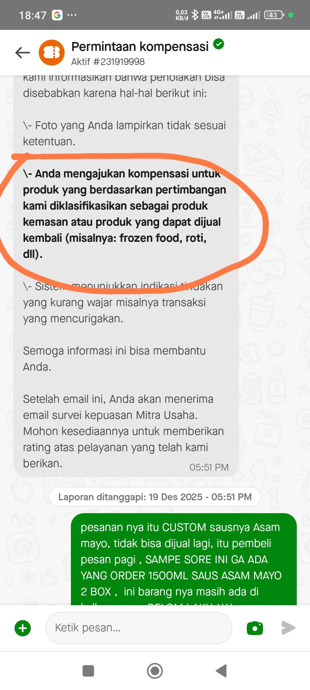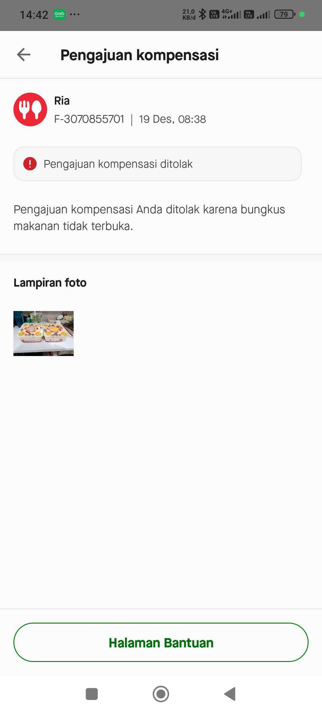 Saat hendak mengajukan kompensasi, kami memfoto makanan seperti terlampir, tetapi pengajuan kompensasi kami ditolak dengan alasan bungkus makanan tidak terbuka. Padahal jelas terlihat makanannya sudah ready dan tidak terbungkus plastik. Kenapa bisa ditolak?