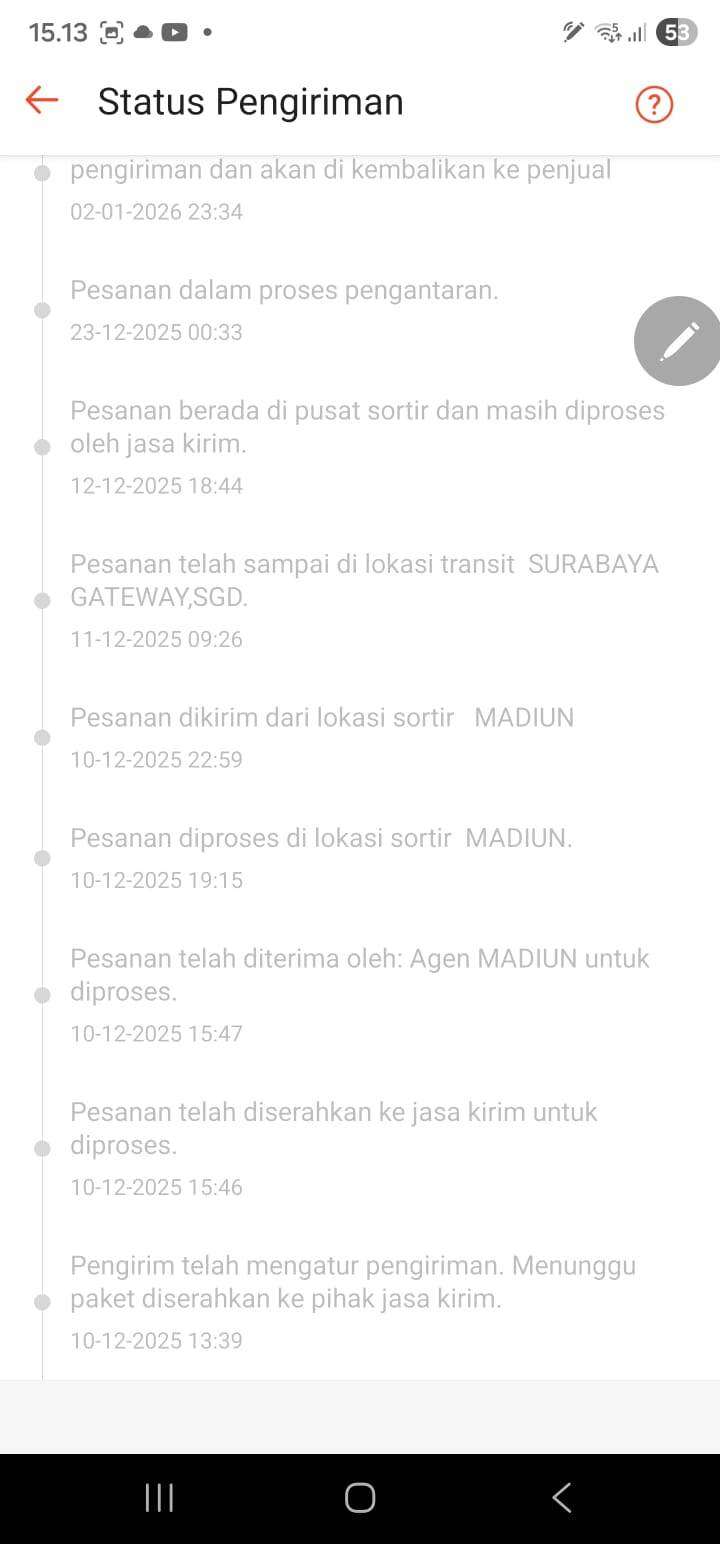 Saya adalah seller di Shopee. Pada tanggal 10 Desember 2025 saya mendapatkan pesanan 1 unit laptop DELL Latitude 9410 seharga Rp6.200.000 dengan nomor pesanan Shopee 2512101C95CMDG. Pada tanggal 10 Desember 2025 itu pula saya langsung melakukan packing dan mengirim pesanan tersebut. Lokasi penerima pembeli berada di Jombang, Jawa Timur, sedangkan lokasi penjual mengirim dari Ponorogo, Jawa Timur, yang notabene tidak terlalu jauh. Jika ditempuh dengan kendaraan bermotor kurang lebih hanya sekitar tiga jam saja.