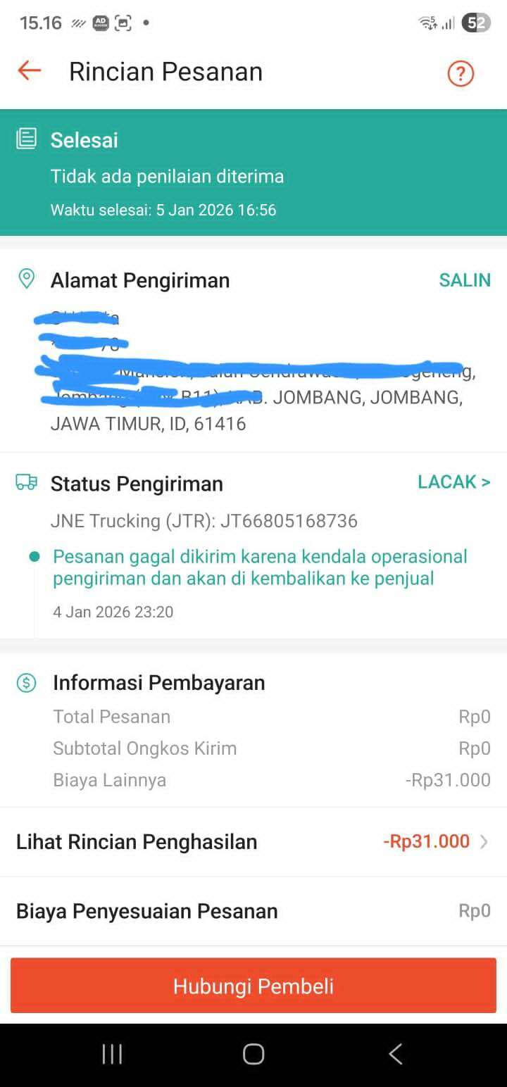 Akhirnya, pada tanggal 2 Januari 2026 pembeli melakukan komplain pesanan di Shopee, dan Shopee menyelesaikan komplain tersebut dengan keputusan mengembalikan uang ke pembeli serta mengembalikan barang ke penjual.