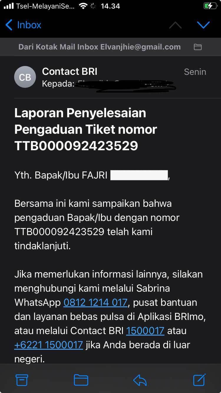 Pada tanggal 7 Januari 2026, saya kembali menerima email laporan dengan nomor TTB000092200279 yang menyatakan telah selesai ditindaklanjuti. Namun, hasilnya masih sama seperti sebelumnya, tanpa ada informasi atau hasil terkait pengiriman yang diberikan kepada saya. Di sini, saya mulai meragukan kredibilitas BRI sebagai bank yang telah saya percayai selama 10 tahun untuk urusan perbankan dan 6 tahun sebagai nasabah kartu kredit BRI. Sejak tahun 2020, pelayanan yang diberikan terasa kurang memuaskan.