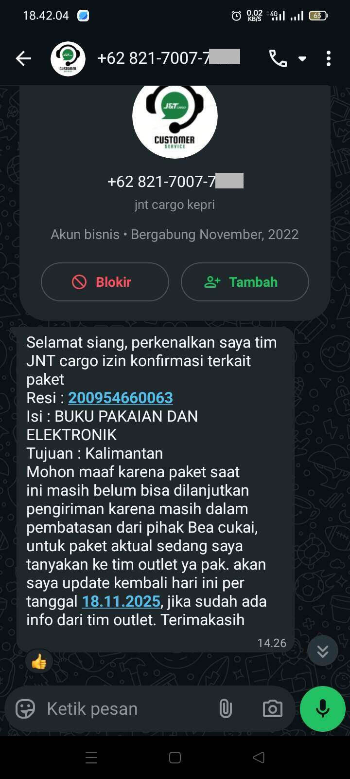 Per tanggal Rabu, 26 November 2025, barang tak kunjung sampai. Padahal saya selaku pengirim sekaligus penerima sudah berkali-kali mengajukan refund karena sudah menyerah akan layanan J&T Cargo yang ini. Sudah 4 bulan saya berusaha meminta refund.