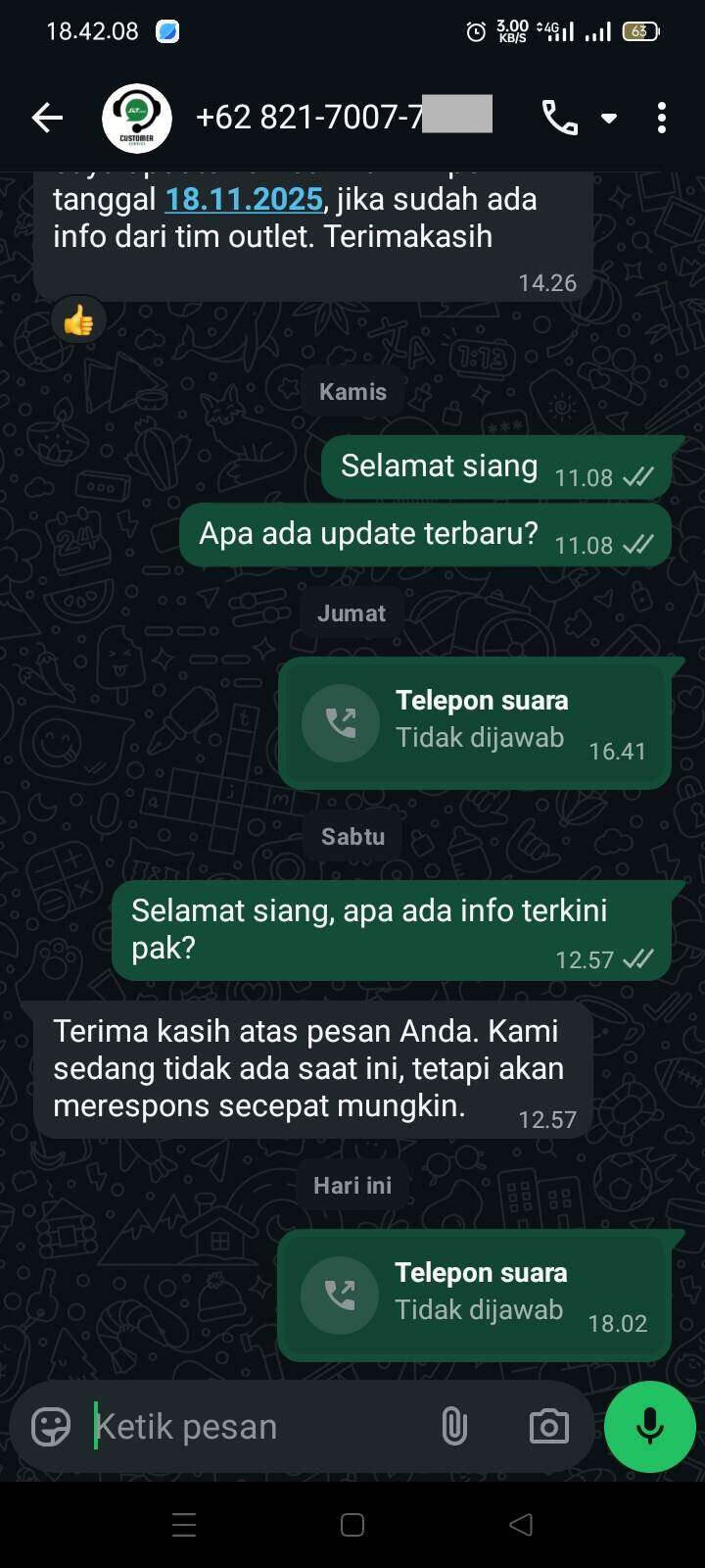 Hampir setiap hari saya telepon call center-nya J&T, dan hasilnya selalu tak memuaskan. Saya sudah di Kalimantan, saya masih ada teman di Karimun yang bisa bantu saya untuk memindahkan barangnya, tapi gila! Empat bulan minta refund seperti tak ditanggapi.