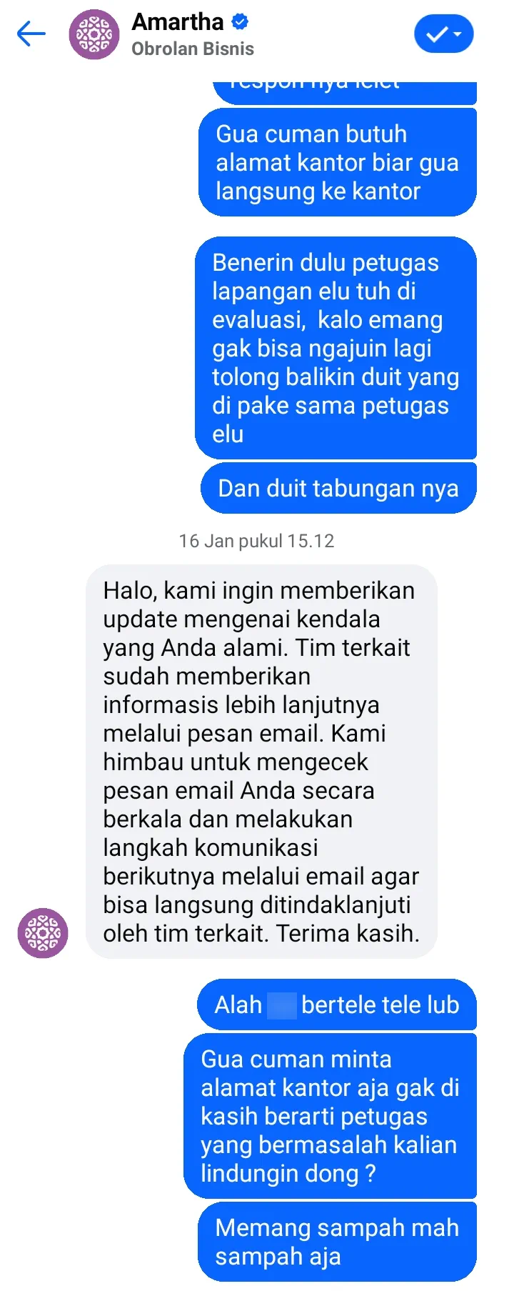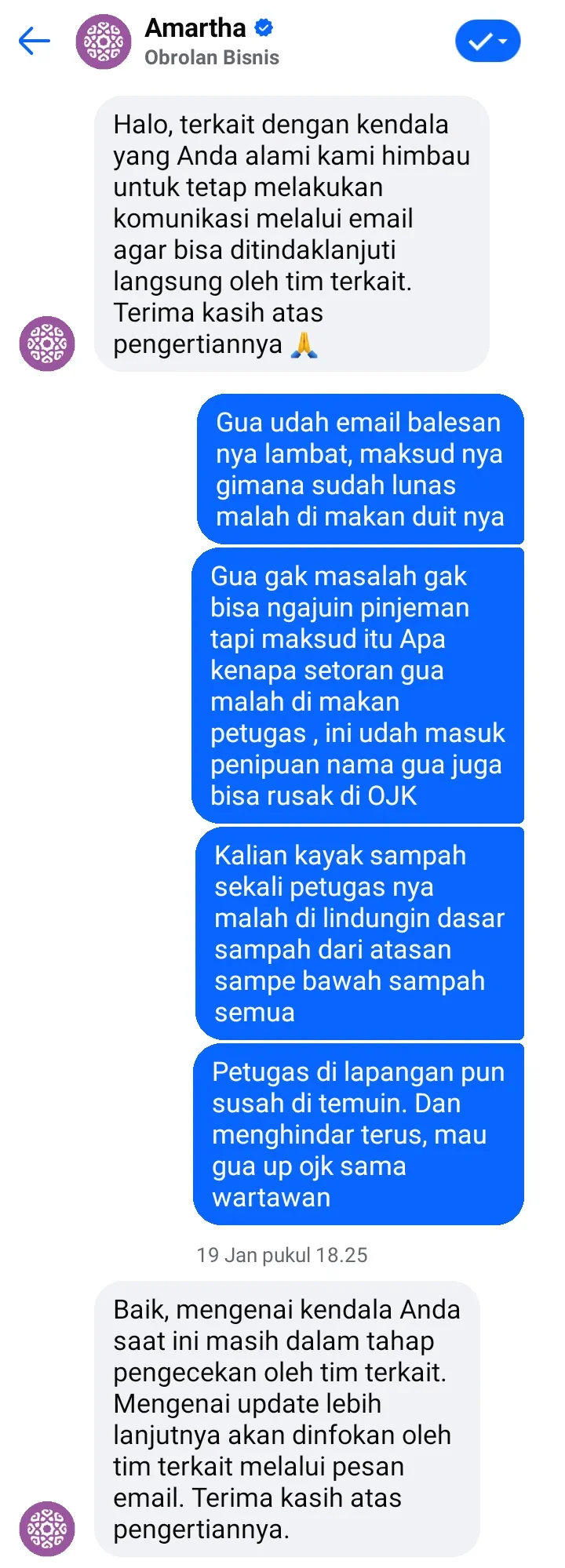Ibu saya, atas nama Sri Astuti, adalah nasabah Amartha. Tolong perhatiannya, terkait petugas kolektor Amartha yang bermasalah. Ibu saya sudah melakukan pelunasan dan selalu membayar cicilan melalui petugas kolektor, tetapi kenapa di aplikasi masih ada tagihan? Padahal ibu saya tidak pernah telat melakukan pembayaran. Ibu saya gaptek, dan ketika ditanyakan ke petugas kolektor, ibu saya tidak diberikan kesempatan untuk mengecek ke aplikasinya.