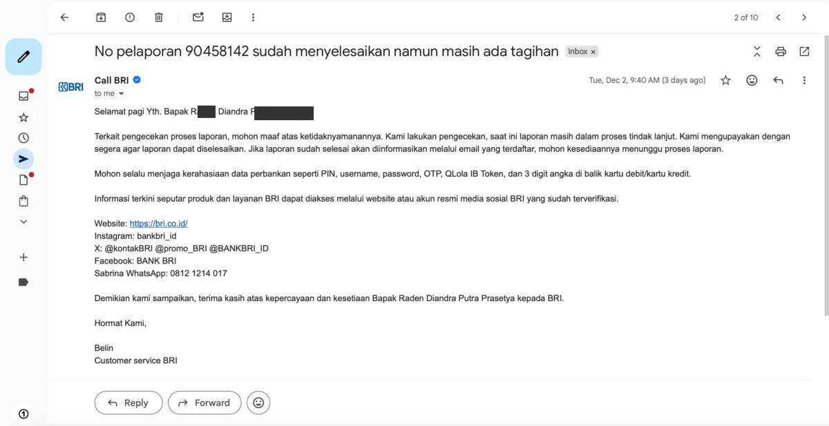 Hingga akhirnya, pada tanggal 1 Desember 2025, saya mengirimkan laporan melalui email ke BRI di callbri@bri.co.id. Namun sampai sekarang, tanggal 5 Desember 2025, belum ada kejelasan dari pihak collection. Saya lampirkan nomor pelaporan saya, yaitu: 90458142.