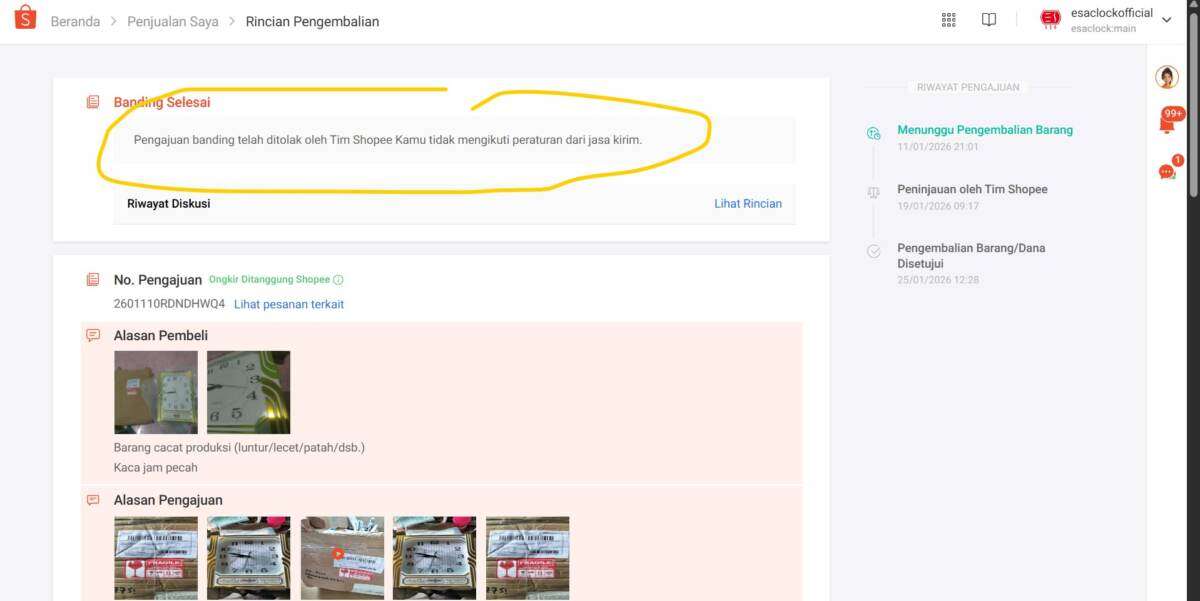 Tanggal 25 Januari 2026, pengajuan banding kami ditolak dengan alasan tidak mengikuti peraturan jasa kirim.