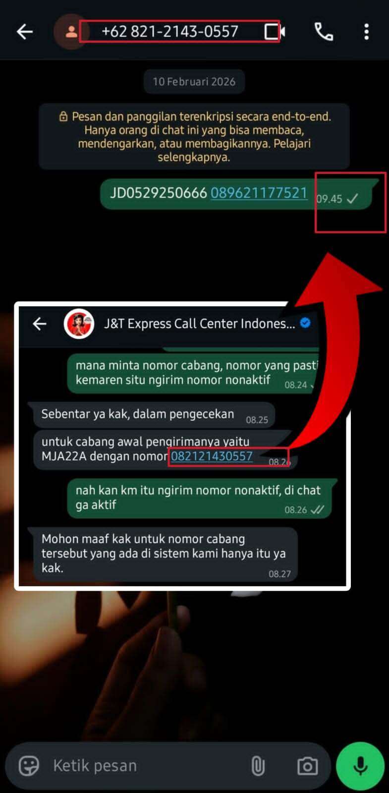 - Pada tanggal yang sama (19 Januari 2026), saya sudah menyerahkan seluruh dokumen pendukung yang diminta oleh pihak J&T, mulai dari foto KTP, foto buku tabungan, hingga bukti invoice barang.