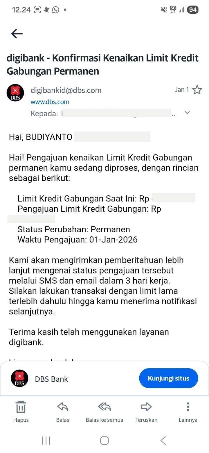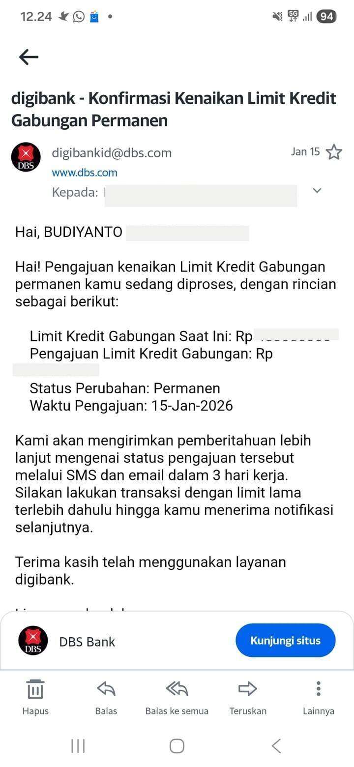 Pada akhir September 2025, saya melakukan upgrade menjadi nasabah DBS Treasures di cabang PIK dengan saldo minimal Rp1 miliar. Karena saya mengikuti program tersebut, saldo saya di-hold selama enam bulan. Menurut informasi yang saya terima, setelah minimal tiga bulan menjadi nasabah DBS Treasures, saya seharusnya bisa mengajukan kenaikan limit kartu kredit DBS, yang telah saya miliki selama lebih dari 10 tahun.