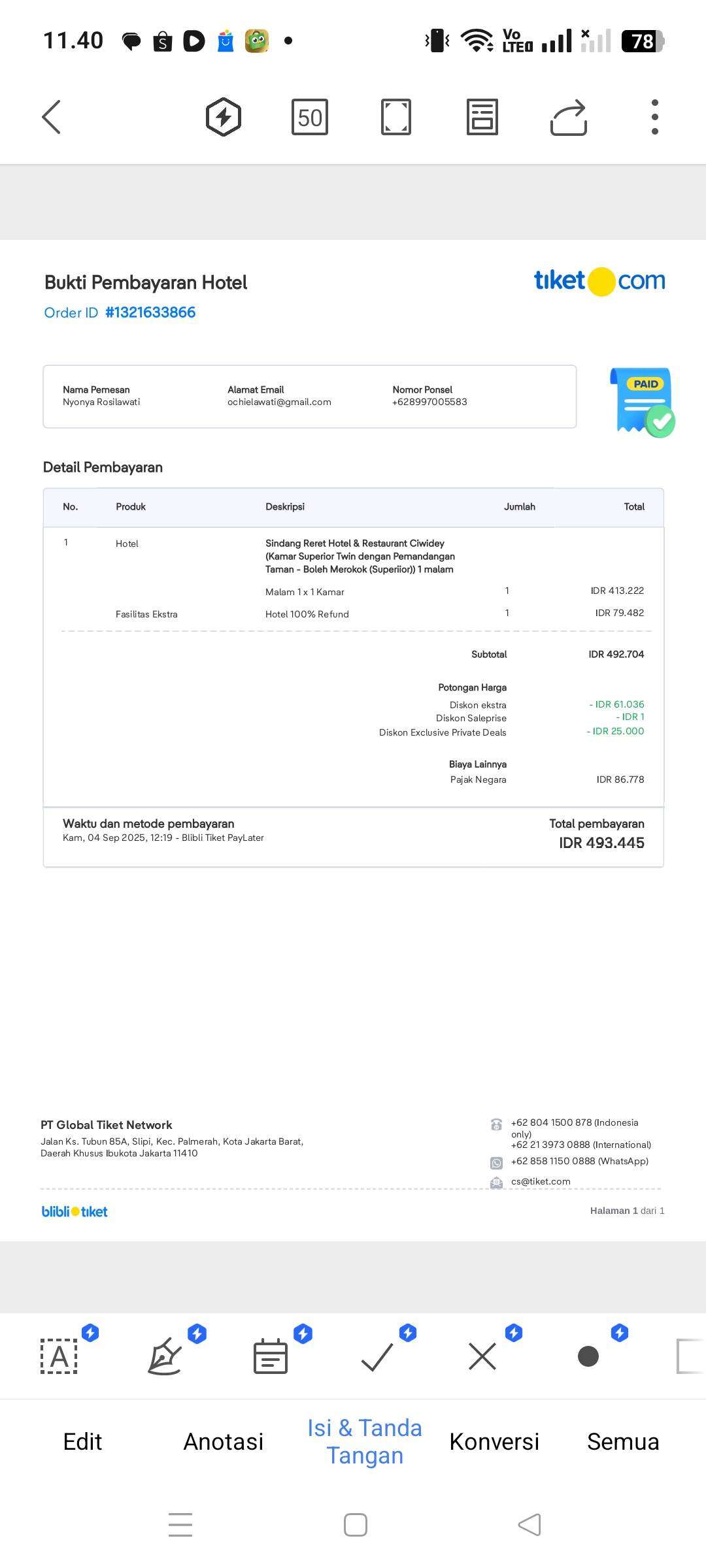 Pada hari Kamis, 4 September 2025, saya memesan/booking kamar hotel di daerah Ciwidey, Kabupaten Bandung, yaitu Hotel Sindangreret. Saya memang berencana pergi liburan ke Ciwidey pada tanggal 30 November–1 Desember 2025. Saya biasa memesan kamar hotel menggunakan aplikasi Tiket.com dengan pembayaran tunai. Namun kali ini saya mencoba melakukan booking hotel dengan metode pembayaran Blibli Ticket Paylater.
