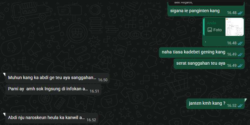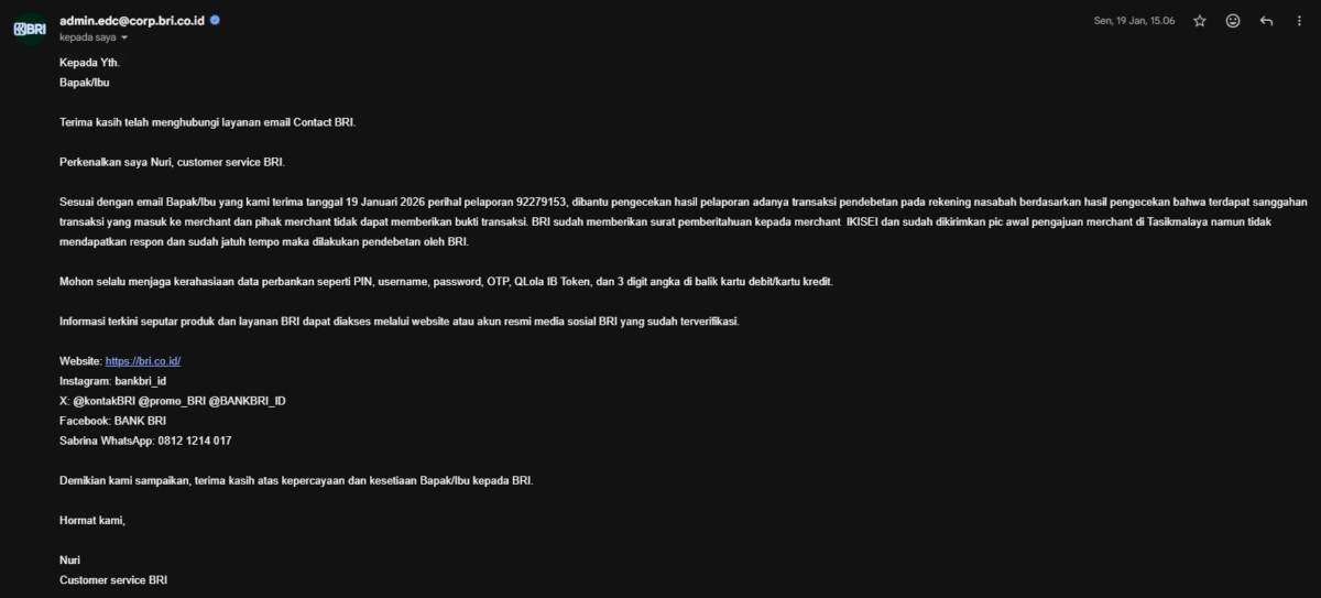 Saya coba hubungi lagi lewat email dan responsnya tetap sama. Dari pihak BRI telah mengirimkan surat ke kantor BRI Tasikmalaya, tetapi PIC atau orang yang biasanya saya hubungi tidak pernah mendapatkan surat tersebut.