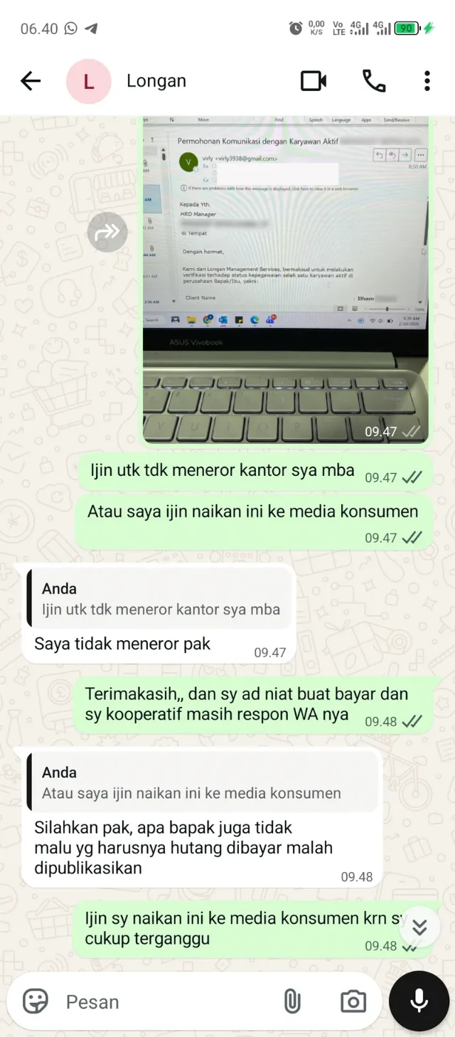Sisa tagihan saya masih Rp2 juta, yang memang macet sejak saat pandemi covid. Saya sudah berkomunikasi dengan salah satu desk collection untuk meminta waktu pembayaran secara cicilan karena kondisi keuangan saya belum memungkinkan. Berikut saya lampirkan bukti pembayaran terakhir, bukti email dari mereka ke kantor, dan bukti percakapan saya dengan salah satu tim Longan.