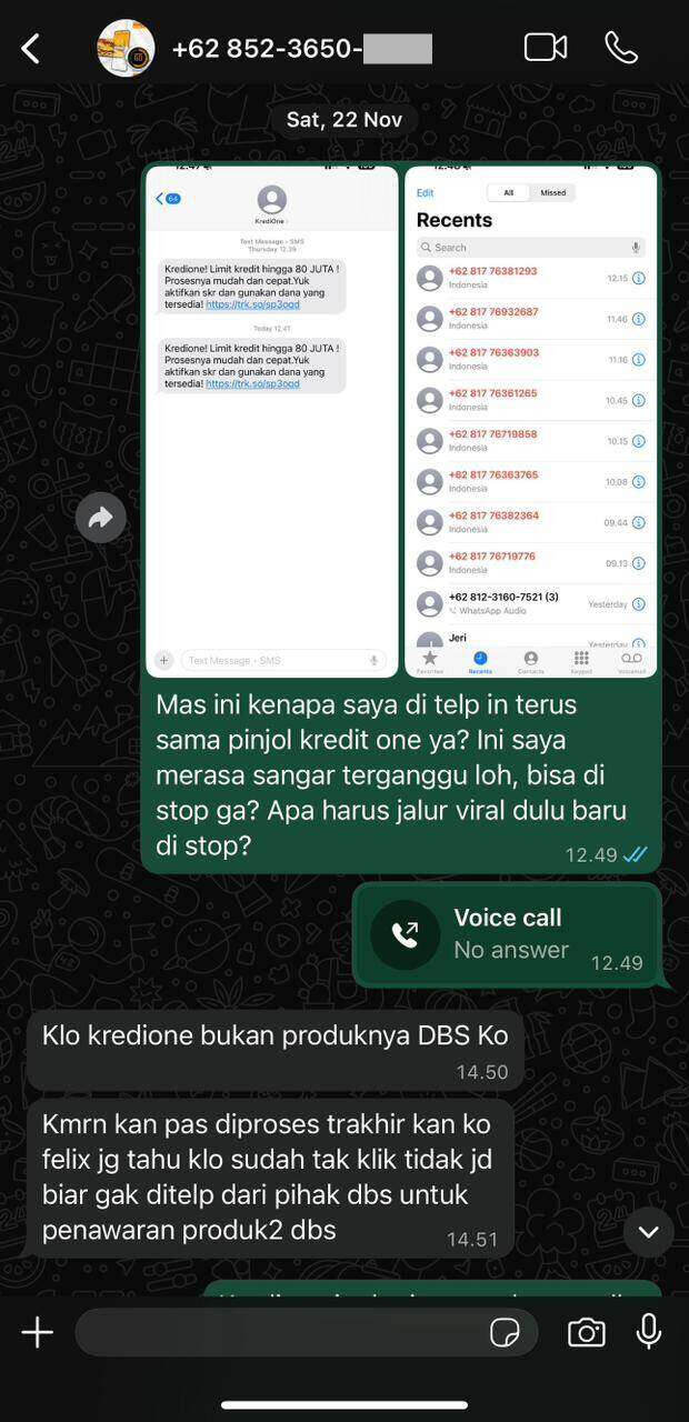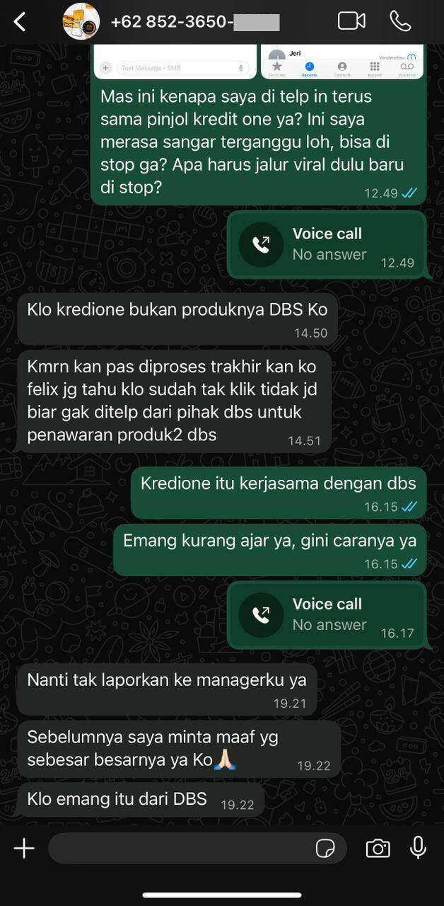 Namun, sales tersebut berkilah bahwa Kredione bukan bagian dari Bank DBS. Padahal, dari informasi yang saya temukan, Kredione dan DBS bekerja sama dalam layanan fintech. Dugaan ini semakin kuat karena teror telepon mulai terjadi setelah saya mendapatkan kartu kredit DBS.