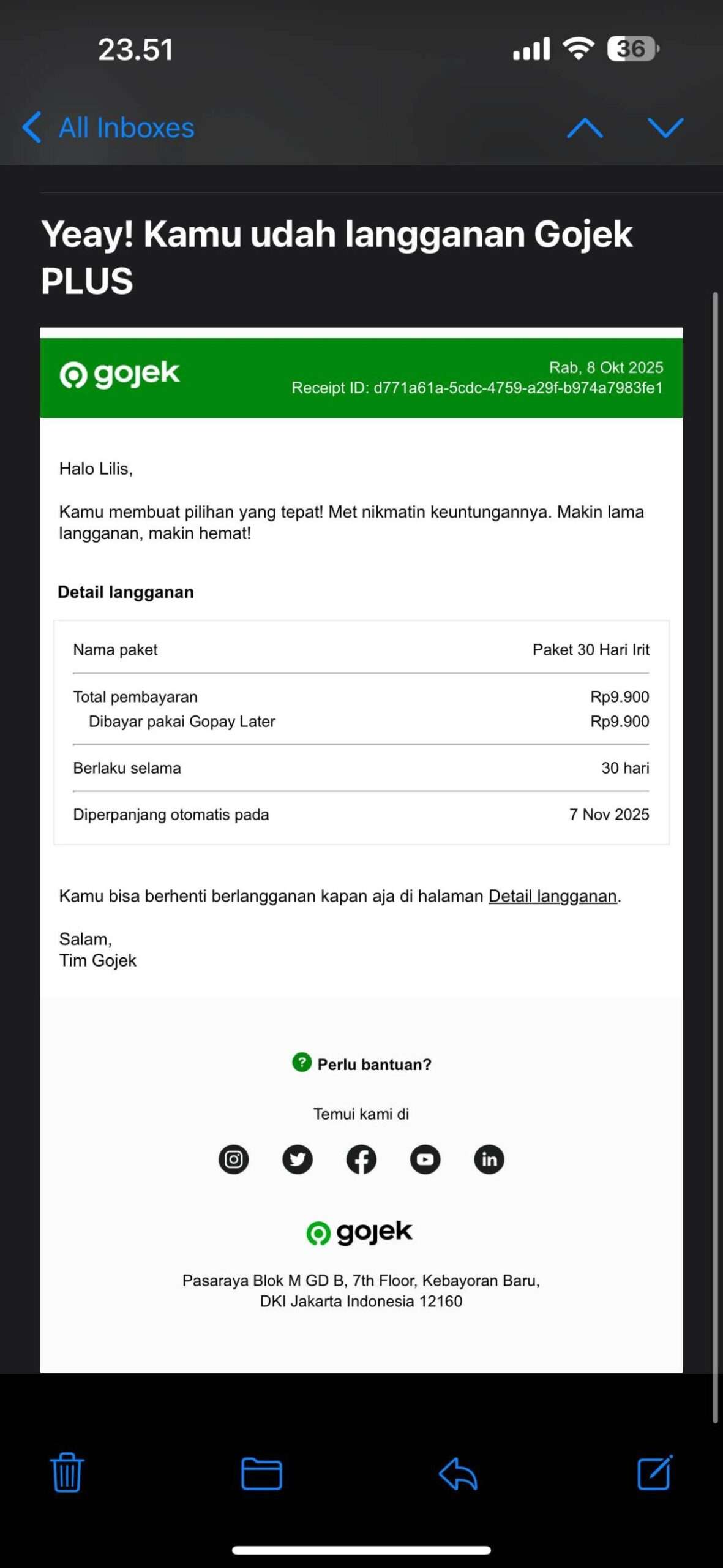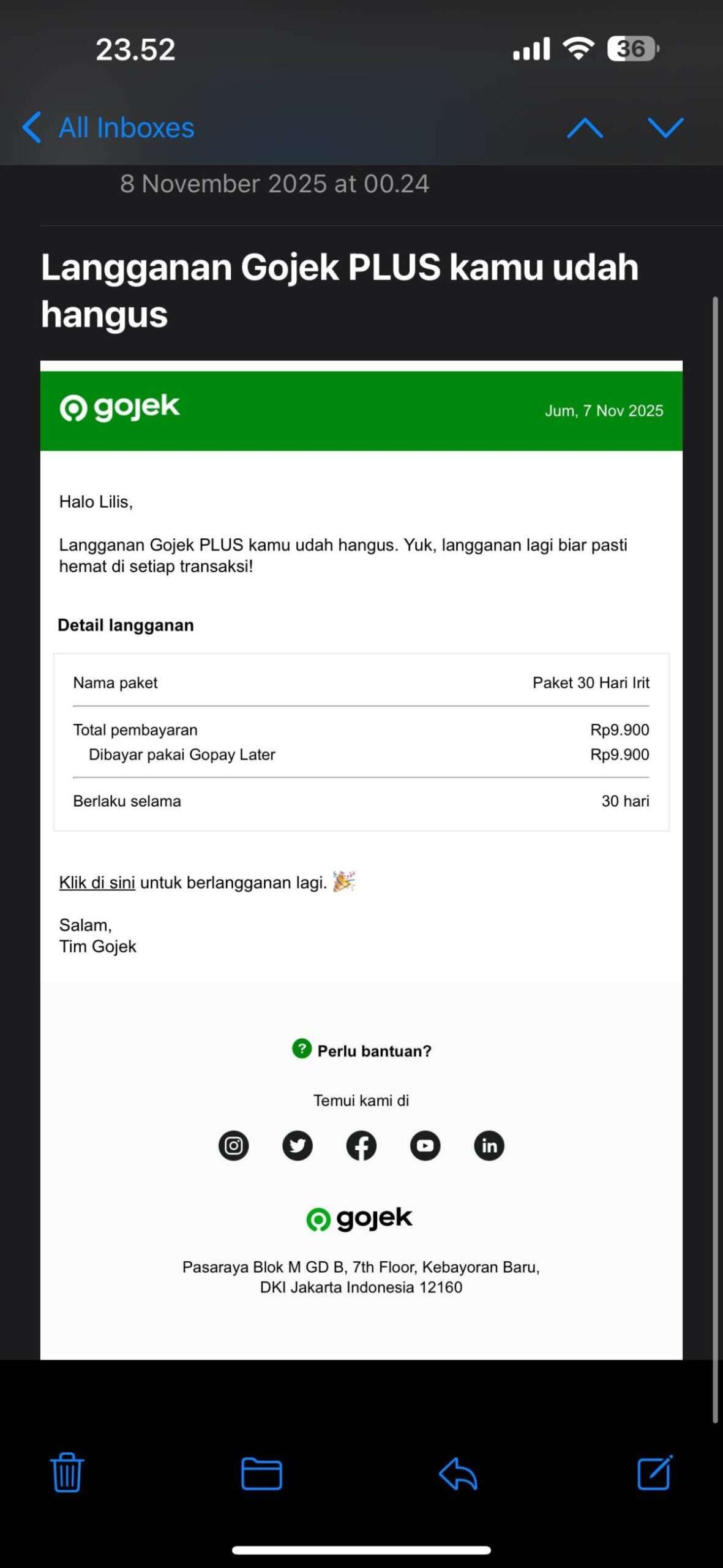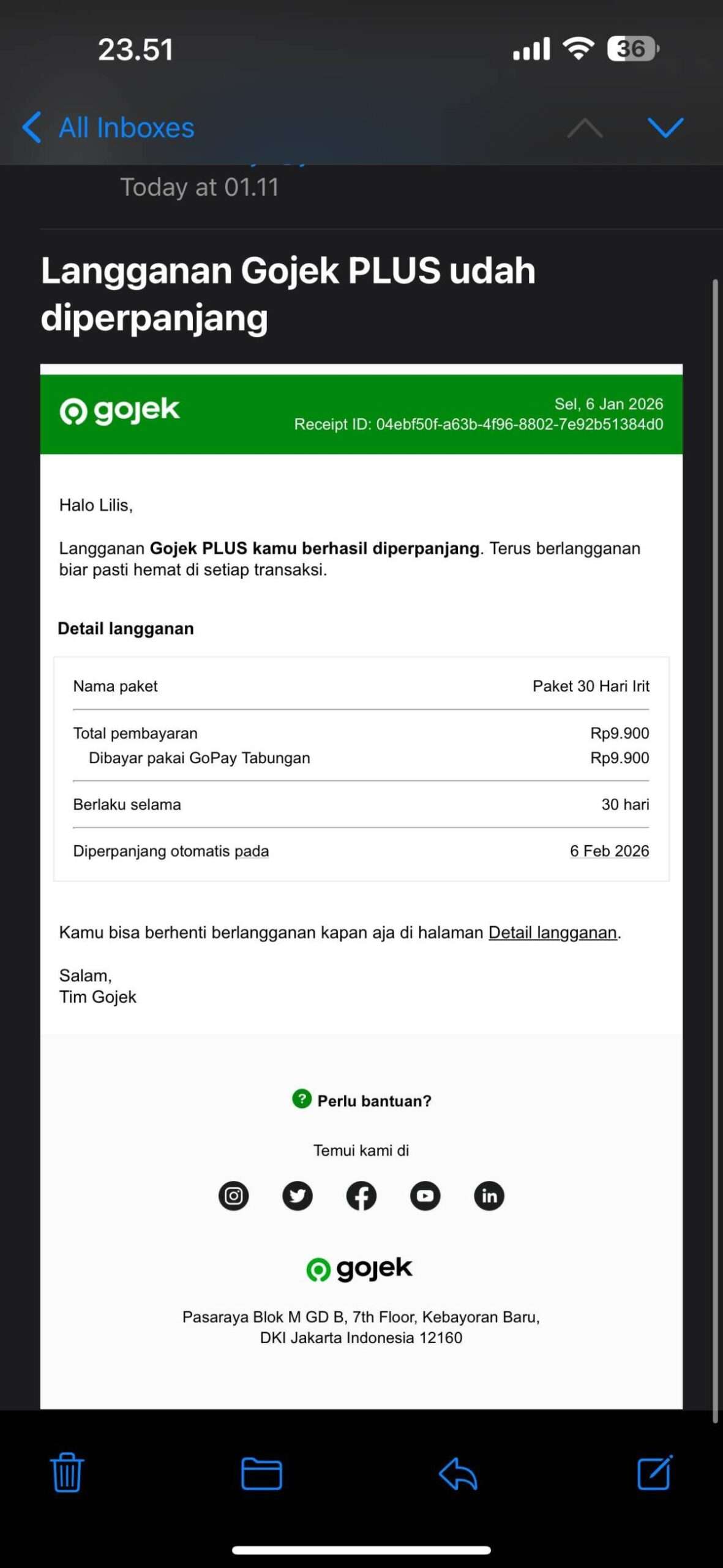 Saya sudah aware kalau paket Gojek Plus saya berakhir tanggal 7 Januari 2025, namun saya lalai mengosongkan saldo GoPay saya. Biasanya kalau saldo saya insufficient funds, Gojek Plus akan otomatis berhenti di hari berikutnya (H+1) setelah tanggal recurring.