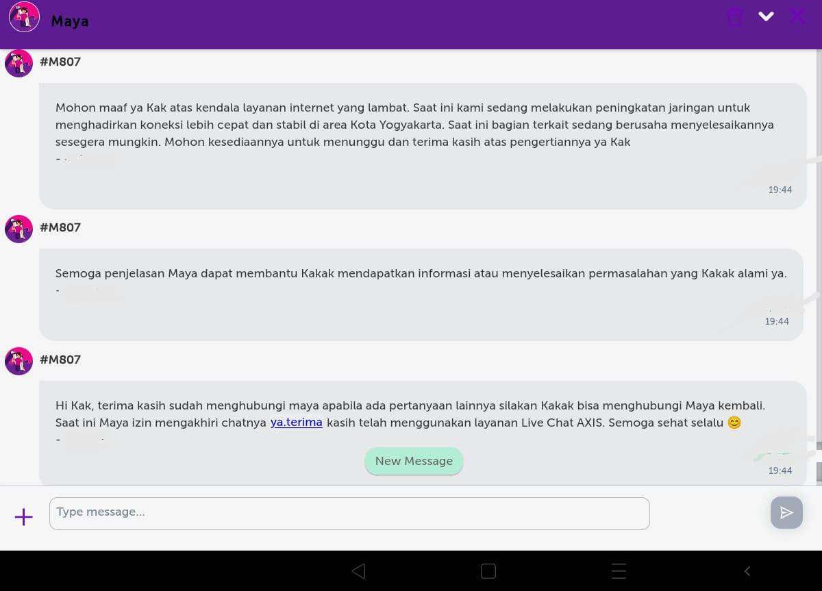 Saya sudah mencoba menghubungi Customer Service Axis melalui aplikasi Axisnet. Hanya diberikan informasi bahwa sedang ada peningkatan jaringan dan saya diminta menunggu saja. Tidak ada informasi sampai kapan kendala tersebut berlangsung. Saya ingin menggunakan paket dan mengakses internet sekarang karena kendala sudah terjadi sejak kemarin.