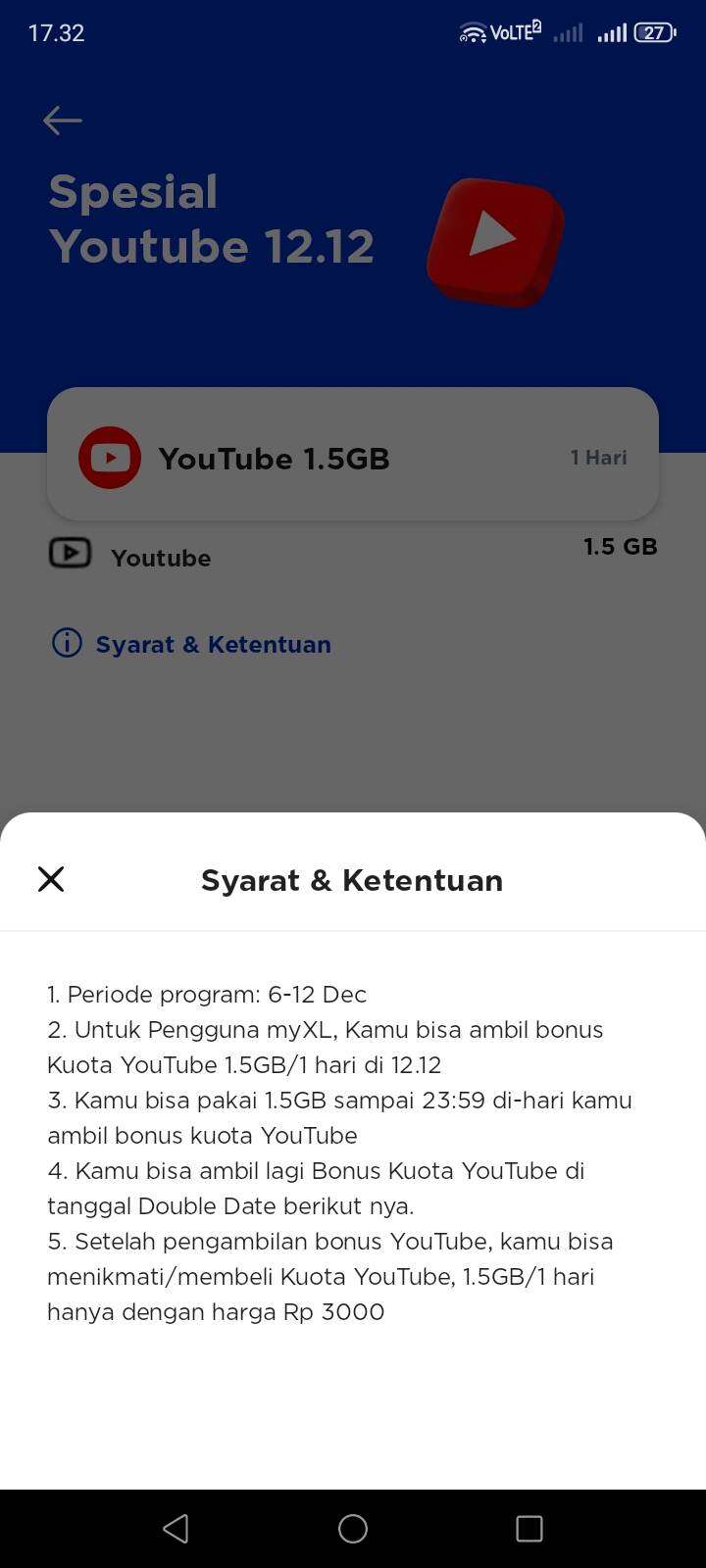Saya adalah pengguna baru XL karena sering direkomendasikan oleh teman bahwa provider ini memberikan penawaran bonus yang banyak serta harga paket yang murah dibandingkan dengan provider lain. Setelah memutuskan melakukan pembelian kartu perdana, saya coba login di aplikasi myXL dan ternyata benar ada penawaran spesial YouTube 12.12 dengan kuota 1,5 GB untuk 1 hari dengan harga Rp0.