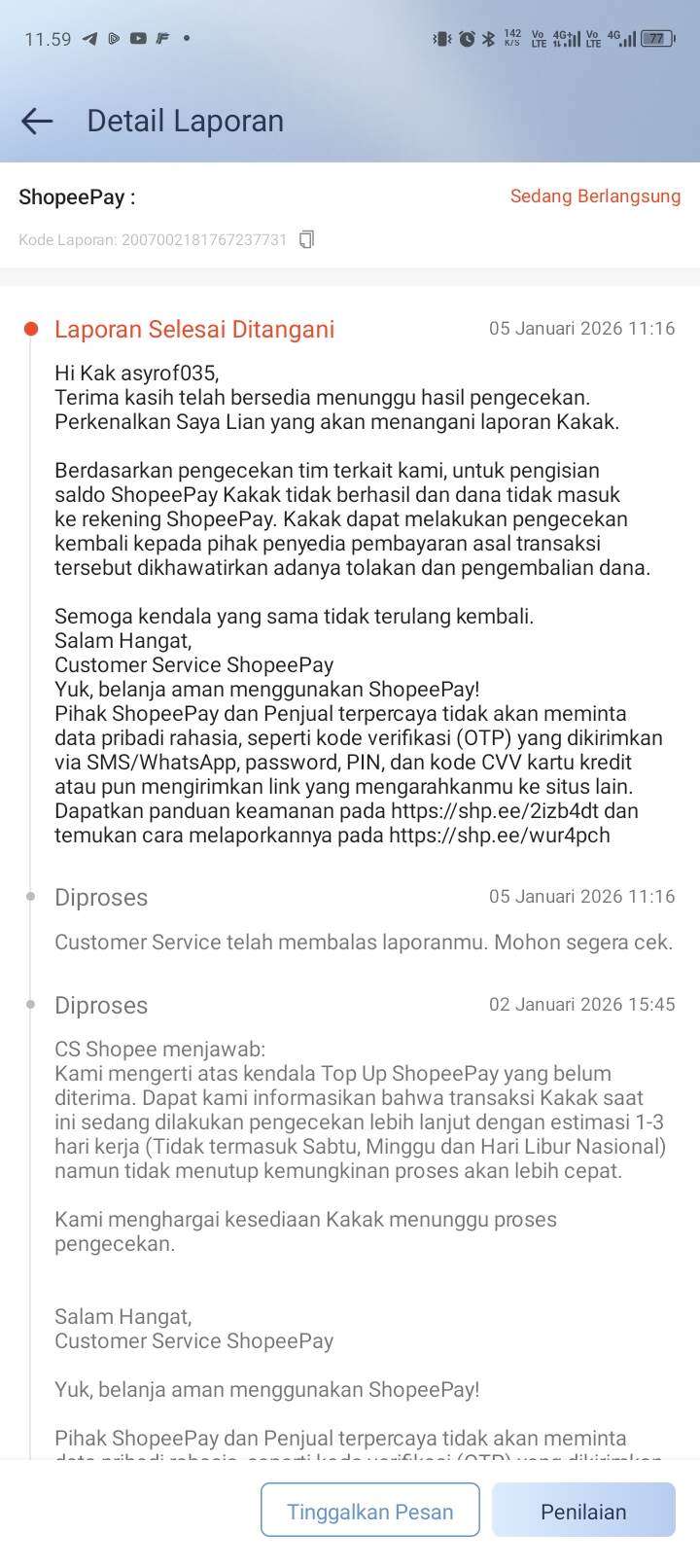 Saya juga telah melakukan pelaporan mandiri terhadap pihak Shopee, dengan nomor laporan: 2007002181767237731. Hasil dari investigasi resmi Shopee menunjukkan bahwa dana tersebut ditolak oleh sistem dan tidak masuk ke Shopee, sehingga pihak Shopee menyarankan saya untuk meminta refund (pengembalian dana) kepada pihak DANA.