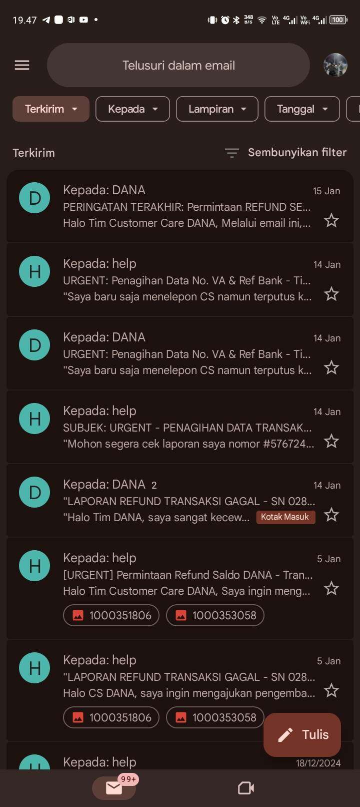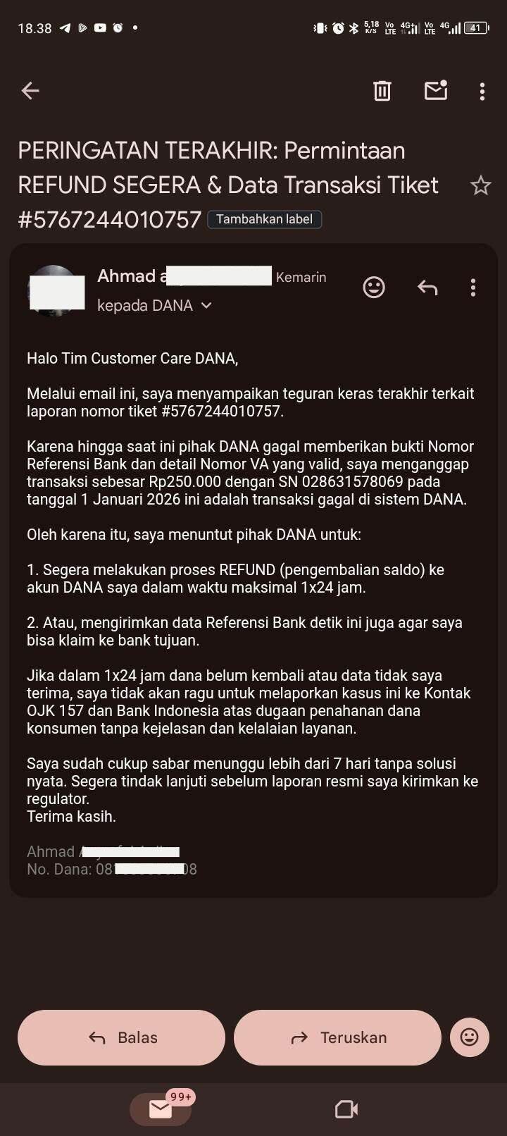 Melalui surat pembaca ini, saya menyatakan keberatan keras dan melayangkan tuntutan pengembalian saldo (refund) sepenuhnya sebesar Rp250.000 kepada pihak DANA (PT Espay Debit Indonesia Koe).